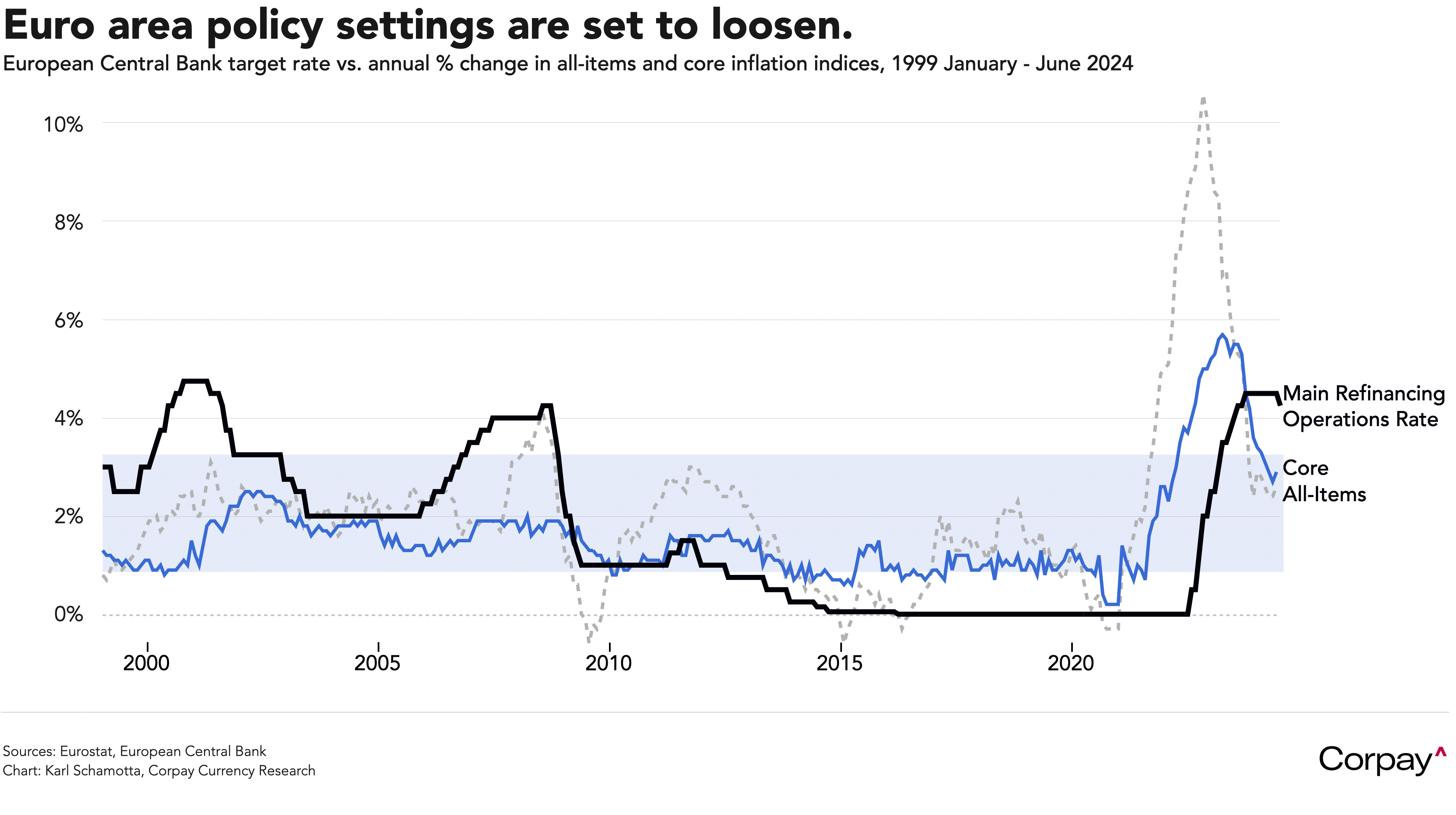 Market focus will be centred on the press conference, where Madame Lagarde may try to fight a rear-guard action against investors who expect a rapid cadence of rate cuts to unfold in coming months. A forceful emphasis on upside risks to growth and inflation could see the euro break through the 1.09 level to the topside. Alternatively, she may drop hints about a September move, forcing a consolidation in already-wide rate differentials and putting the common currency under renewed pressure.