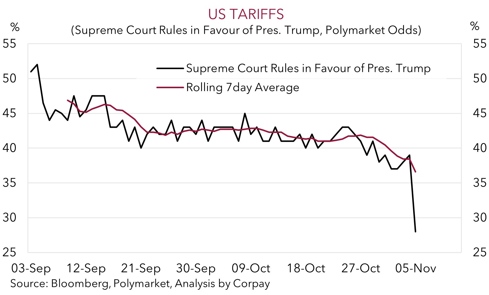 Also getting attention is the hearing in the US Supreme Court on the legality of President Trump’s sweeping tariffs. Notably, during arguments some of the conservative justices appeared sceptical about the use of emergency powers and that the President might have overstepped his authority. As our chart shows, market odds the Supreme Court rules in President Trump’s favour have slumped after today’s proceedings. If President Trump were to lose, refunds of the tariffs already paid are likely, and risk assets may react positively due to the improved global growth outlook. However, we would note the levies (which are a cornerstone of the Trump Administration’s policies) could be re-imposed via more complicated legal tools down the track.