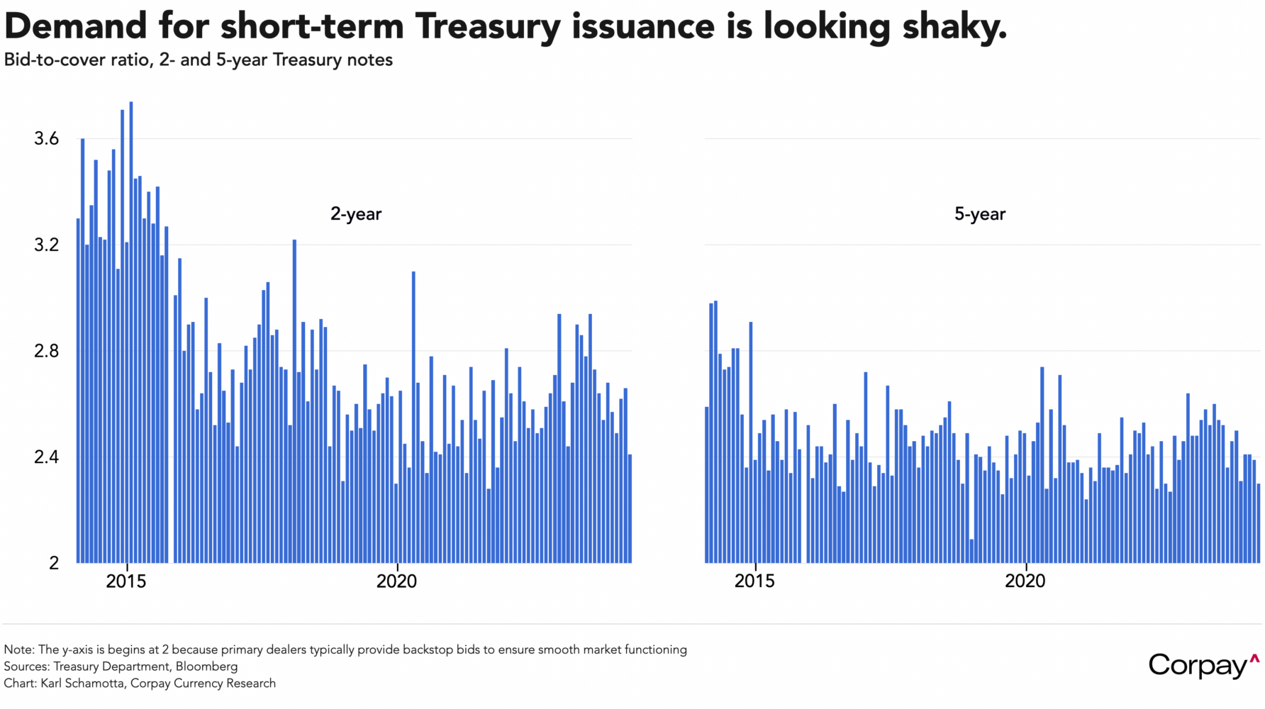 After a series of stronger-than-expected data releases and hawkish comments from Fed officials, markets are struggling to choke down heavy volumes of bond supply. In comments yesterday, the Atlanta Fed’s relatively-centrist President Raphael Bostic said “My outlook is that if things go according to what I expect – inflation goes slowly, the labour market slowly and orderly moves back into a weaker stance, but a stable-growth stance – I’m looking at the end of the year, the fourth quarter, as the time where we might actually think about and be prepared to reduce rates”. Long-term demand remains strong, but bid-to-cover ratios, which measure the total dollar amount of bids entered relative to the amount of Treasuries being sold, each recorded some of the lowest levels seen in recent years in yesterday’s 2-and 5-year Treasury auctions, helping propel yields upward.