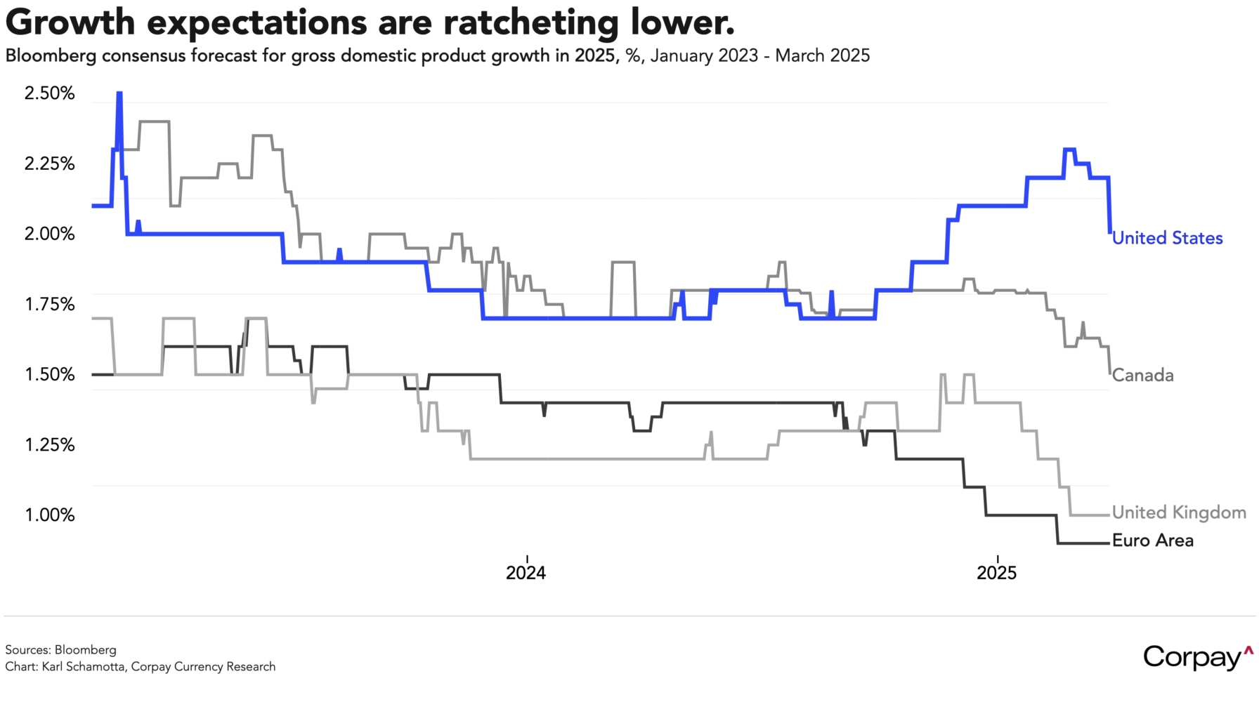 In the days ahead, a series of fundamental data releases could ease or exacerbate fears about the direction of the global economy. With market-implied odds on a rate cut at the European Central Bank’s mid-April meeting sitting close to the 85-percent threshold as traders brace for a tariff-driven economic shock, tomorrow’s inflation numbers for the euro area could remove any nagging doubts. In the United States, the Institute for Supply Management will publish its latest measures of activity in the manufacturing and services sectors, and a raft of labour market reports—including the latest Job Openings and Labor Turnover Survey, private payrolls numbers from ADP, Challenger job losses, weekly jobless claims, and Friday’s non-farm payrolls release—will be carefully parsed for signs that government policy changes are translating into broader economic weakness. And here in Canada, the March jobs report will illustrate the extent to which businesses slowed or halted their hiring activities in the face of the Trump administration’s tariff threats.