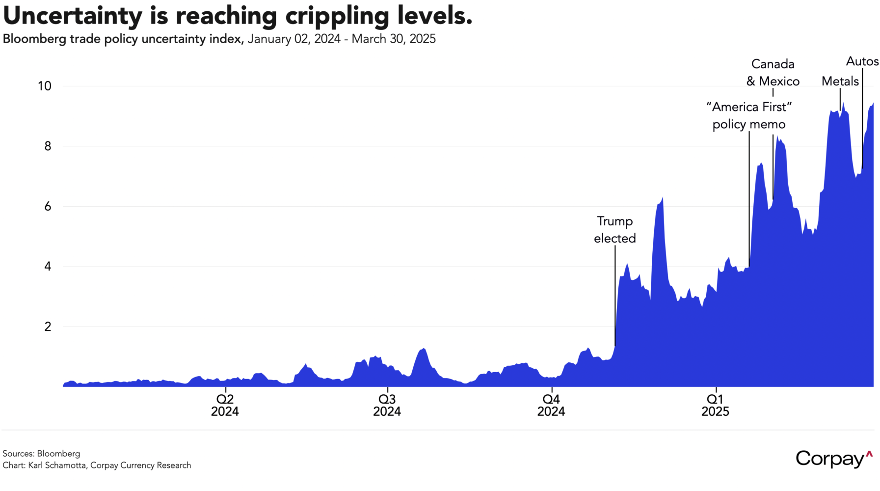 Uncertainty is high. After a series of threats, drip-feed announcements, delays, and reversals, markets have no clear understanding of how the so-called “reciprocal” tariffs will be calculated, which countries and sectors might be affected, or when they will be implemented. Administration officials appear equally uninformed—in recent interviews, Scott Bessent, Howard Lutnick, Stephen Miran, and Peter Navarro have provided wildly-contradictory views on why, how, and where duties might be applied—and Kevin Hassett, the president’s chief economic advisor, yesterday told Fox News that he couldn’t provide any guidance, saying Trump has “a heck of a lot of analysis before him, and he’s gonna make the right choice I’m sure”.