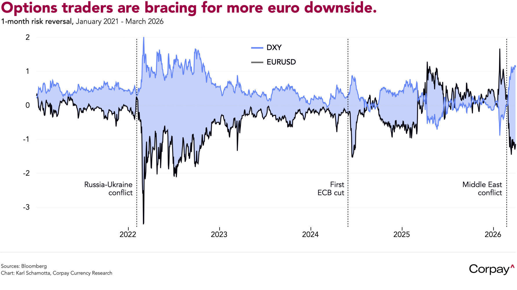 Evidence of an incoming inflation shock is beginning to surface. Data released this morning showed euro area headline prices jumping 2.5 percent in the year to March, accelerating sharply from 1.9 percent the prior month as a 4.9 percent year-on-year surge in energy costs lifted inflation to its highest since January 2025. The European Central Bank is expected to respond with two or three rate increases this year as policymakers seek to forestall wage and price spillovers, and currency traders are betting the economy will suffer, growing more slowly than it would otherwise. The euro has slipped below the psychologically important 1.15 threshold against the dollar, and options markets are positioned for further bouts of weakness.
