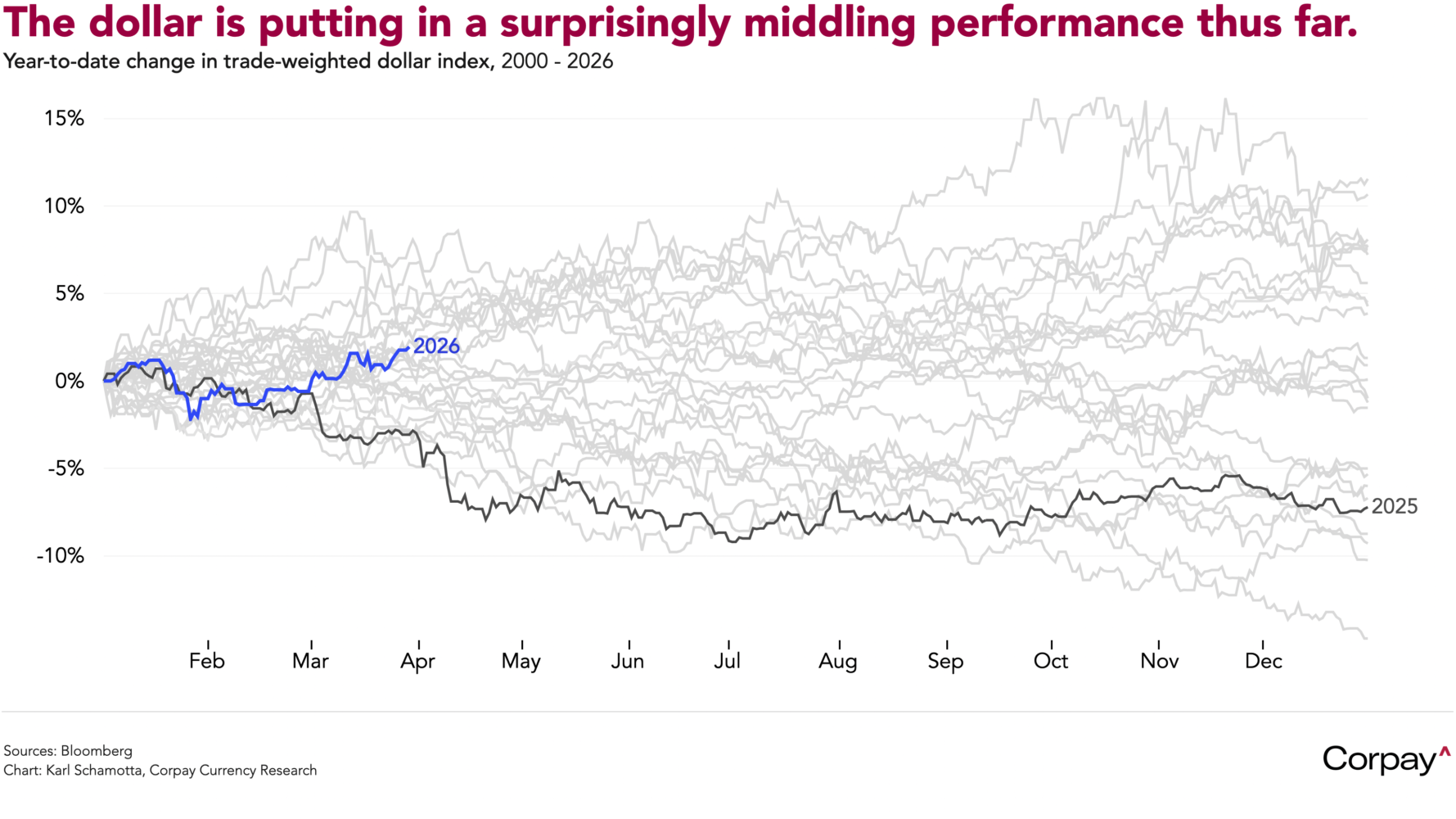 The trade-weighted dollar looks set to close the month with its strongest performance since 2024, but its year-to-date gains appear more pedestrian, particularly when measured against past conflicts. This likely reflects a combination of factors: narrowing cross-currency interest rate differentials among advanced economies, an ongoing rotation out of portfolios that had grown too technology-heavy in recent years, growing fiscal concerns, and a reluctance among international investors to deploy more capital into an increasingly unstable American economy. Taken together, they suggest the currency could face stronger headwinds once the new quarter gets under way.