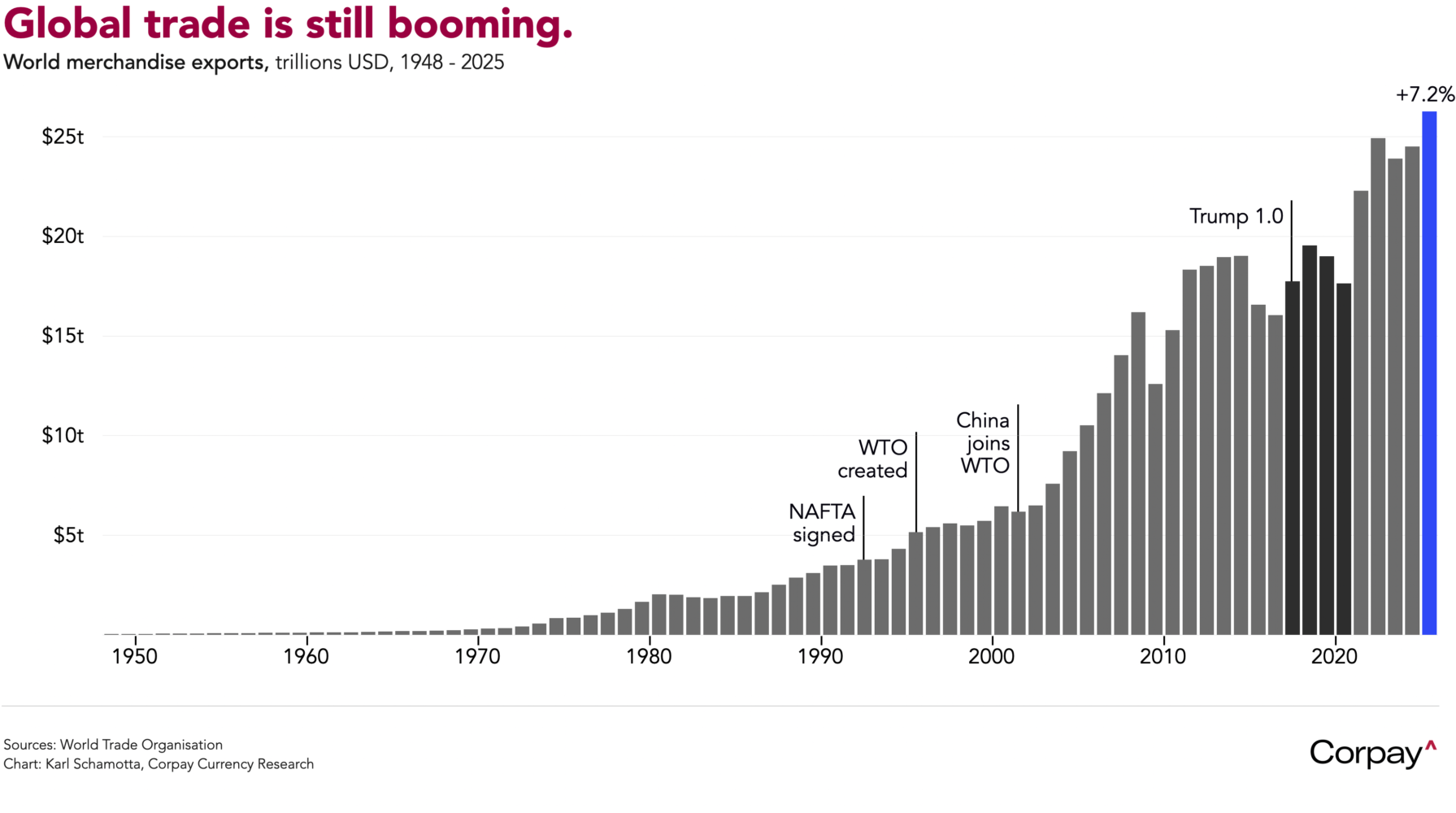 There are reasons for optimism beyond the war, however. As the one-year anniversary of Trump’s “Liberation Day” tariff blitz approaches, it is clear that a substantial escalation in protectionist policy has had a surprisingly modest effect on underlying fundamentals. Tangible goods costs have risen and growth rates have softened, but the US is importing more than ever, deficits remain at record levels, and world trade volumes are in rude health, having jumped 7.2 percent in 2025 from a year prior. It is prudent to keep tail-risk hedges in place as the established order frays, but it is equally important to remember that the underlying calculus driving globalisation for centuries—comparative advantage and technology differentials between nations—remains firmly intact. For businesses, the implications are straightforward: it’s smart to protect against disruption in the near term, but foolish* to bet against continued growth in global trade over the long term.