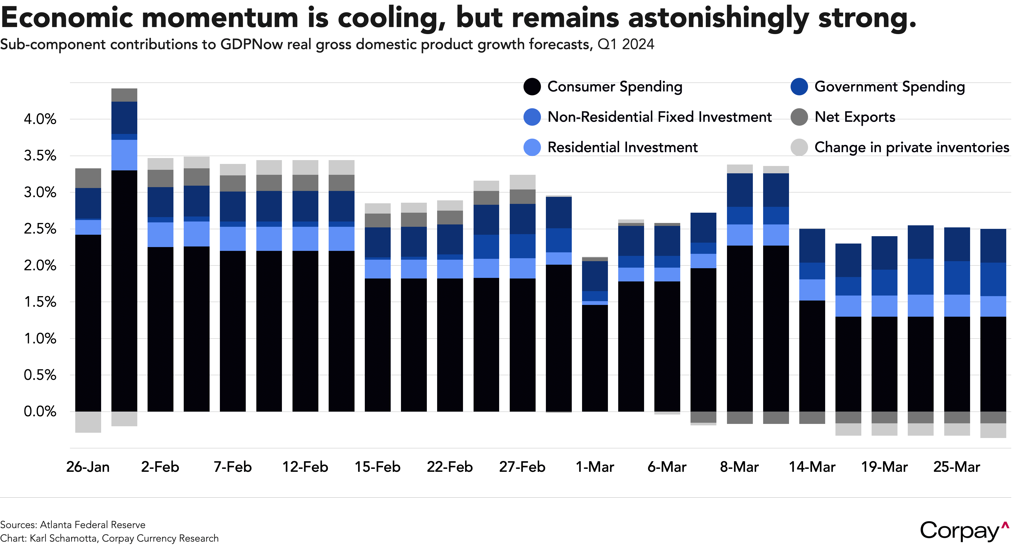 The Federal Reserve’s preferred inflation indicator – the core personal consumption expenditures index – likely slowed in February, with early estimates suggesting that the month-over-month increase dropped to 0.3 percent, down from 0.4 percent in the prior month. Surprises are unlikely: both the consumer price index and producer price index anticipate the print, and during last week’s post-decision press conference, Jerome Powell said he expected a print “well below 30 basis points,” suggesting that the seasonal issues that plagued January’s report would begin to fall out of the data. Strong hiring, hours worked, and wage growth should help keep the personal income and expenditures numbers aloft, pointing to continued resilience in US consumer spending levels. (08:30 EDT)