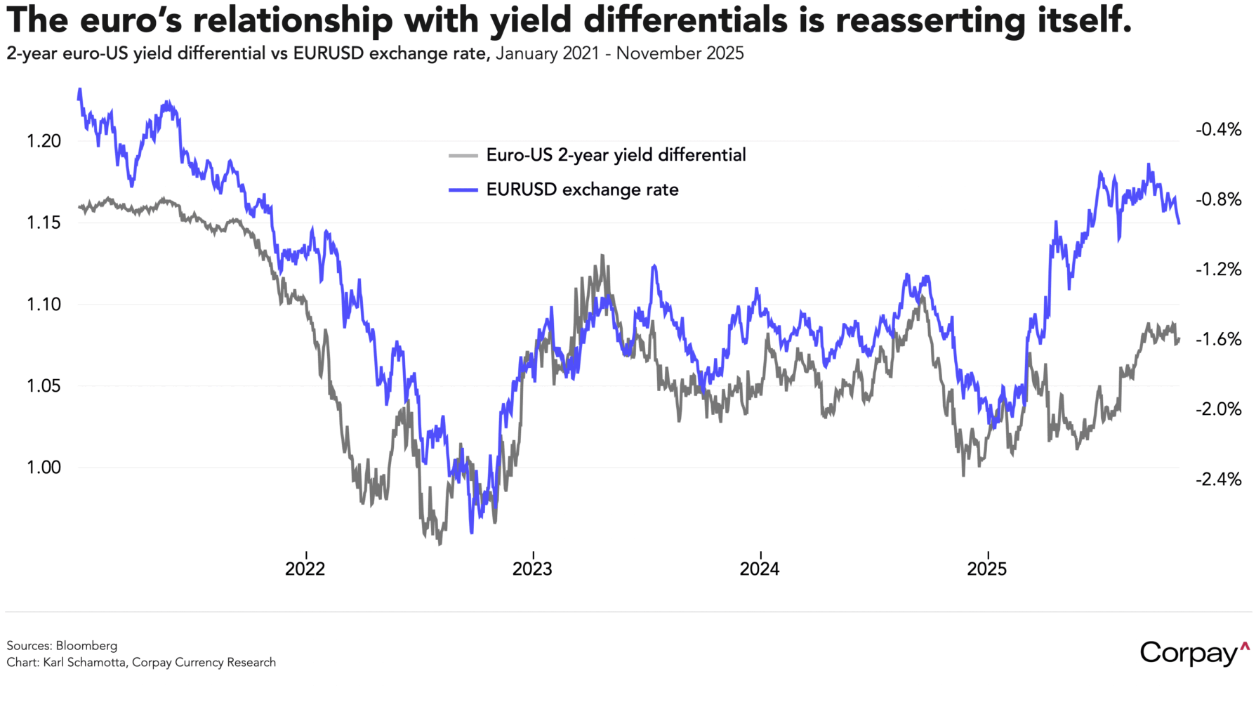 The euro is flirting with key psychological support at the 1.15 threshold as cross-Atlantic rate differentials tilt against the common currency. There have been no major domestic data releases to push market views in one direction or another, and statements from European Central Bank policymakers since last week’s meeting have been consistent with market expectations for a long period on hold, but a hawkish repricing in US yields and a reassertion of the decades-long relationship between yield differentials and the exchange rate is putting the common currency on the back foot.