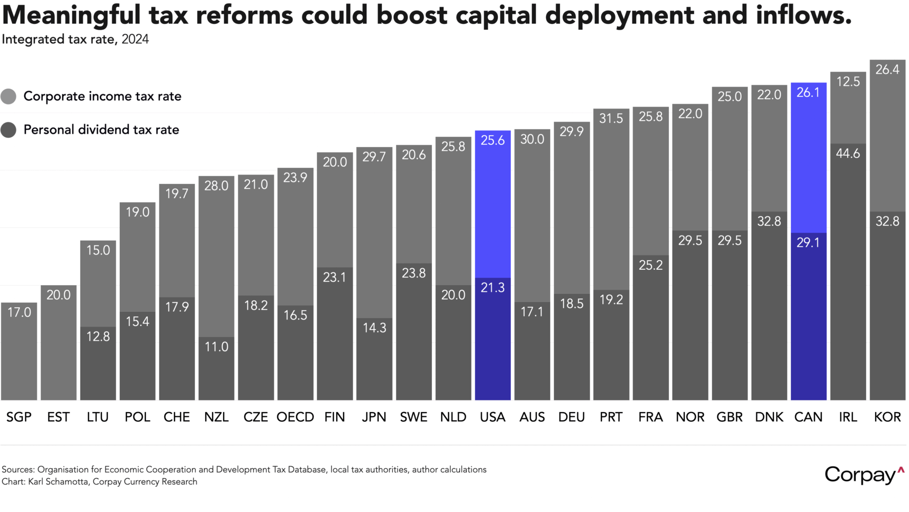 Investors could instead welcome efforts to boost Canadian competitiveness. A meaningful slowdown in public service sector hiring and measurable reductions in regulatory red tape might go a long way toward improving the country’s productivity profile. Tweaks to the immigration system and the foreign credential recognition process that increase the number of skilled workers added to the labour force would drive long-term gains. And a long-needed rationalisation in the tax code—especially the treatment of corporate investment—could make cross-border comparisons more favourable and spark renewed capital flows. If properly framed, today’s budget could help put a floor under the Canadian dollar.