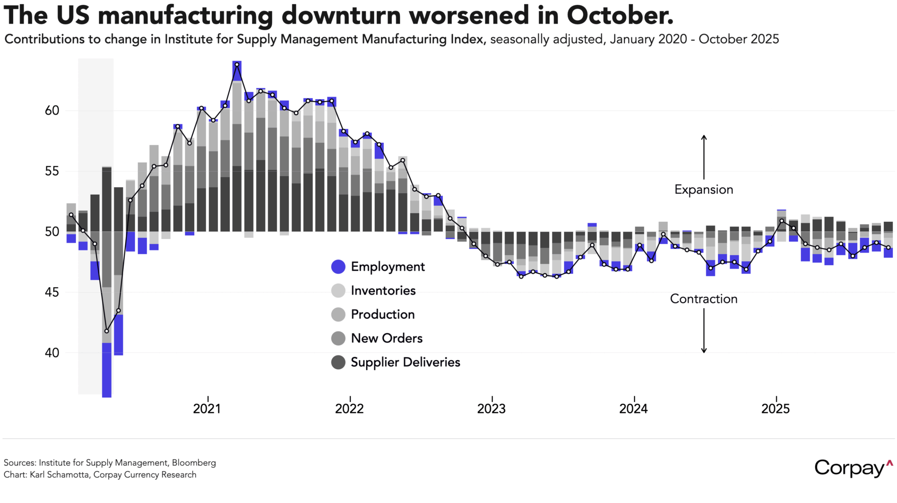 The almighty greenback is holding near a three-month high this morning as investors scale back their exposure to technology stocks and grapple with uncertainty surrounding the Federal Reserve’s next policy move. US equity markets are set to open lower after Palantir Technologies issued a somewhat-disappointing revenue forecast, risking the near-150-percent jump in its share price this year, and intensifying concerns about stretched valuations across the tech sector. Policy-sensitive Treasury yields are easing even after several officials—including Governor Lisa Cook, San Francisco’s Mary Daly, and Chicago’s Austan Goolsbee—signaled a lack of conviction in a potential December rate cut, citing the evolving balance of risks between still-firm employment and elevated inflation.