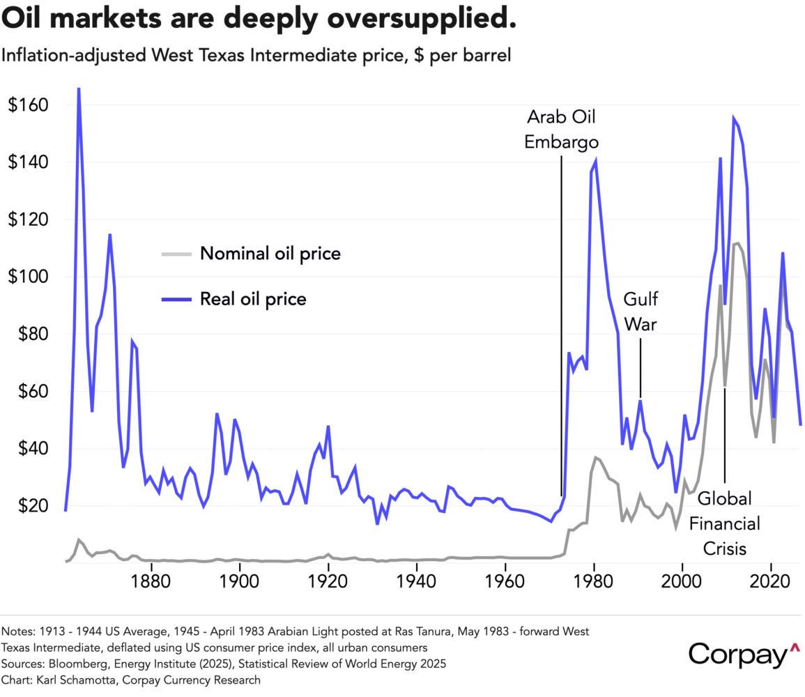 From a mechanical standpoint, the global macro backdrop looks essentially unchanged. After decades of mismanagement, Venezuela’s economy sits on the margins of global goods and capital flows, and bringing its vast oil reserves back online would require billions in long-term investment. Output should rise as the country reopens, but a broader reconfiguration of worldwide distribution networks is hard to justify given elevated political risk and a crude market still in surplus. Real prices are near levels last seen during the 2020 pandemic, the Saudi-led push against shale in 2012, and the early 2000s, before China emerged as a major industrial power.