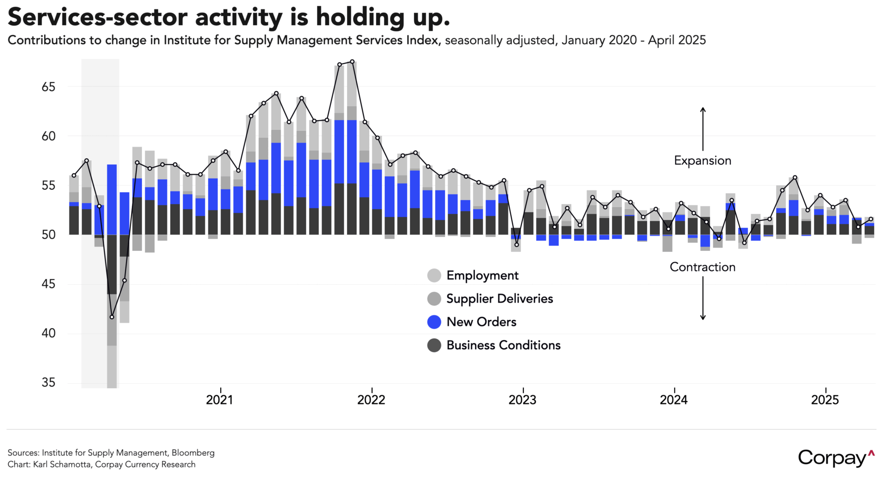 Activity in the US services sector – which accounts for roughly two-thirds of overall economic output – surprised investors by accelerating last month, suggesting that underlying growth could prove more resilient than had been feared. The Institute for Supply Management’s services index climbed to 51.6 in April – up from 50.8 in the prior month, and well above the 50 threshold that separates expansion from contraction – and the closely-watched new orders subindex increased 1.9 points to 52.2, marking its highest level this year. The prices-paid measure jumped 4.2 points to a two-year high however, with nearly 40 percent of purchasing managers seeing costs increasing in line with rising tariffs.