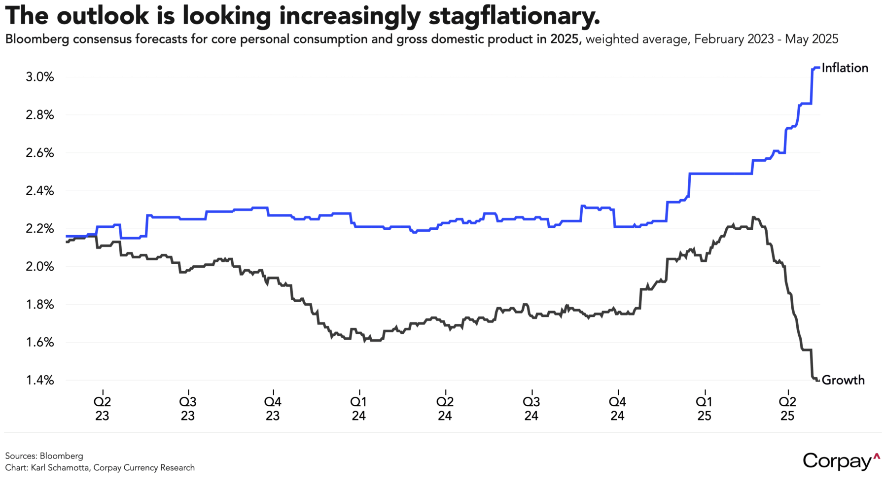 Widespread tariff front-running could help insulate the economy from the consequences of the trade war for at least another month, complicating tomorrow’s Federal Reserve decision. Several Fed officials have signalled a willingness to cut rates if labour markets show signs of softening, but tangible evidence of weakness isn’t yet showing up in the hard data typically used by central bankers to set policy: for now, consumers are buying in anticipation of future price increases, businesses are piling up precautionary inventories, and hiring levels are holding firm. Although investors are bracing for a stagflationary* set of economic outcomes this year, the jury is out on how price and demand dynamics will shift in the months ahead – and there remains considerable uncertainty around the extent to which tariffs will stay in place. As such, it is reasonable to expect a relatively-hawkish tone from Jerome Powell during the post-decision press conference as he downplays employment risks and attempts to keep price expectations anchored for now.