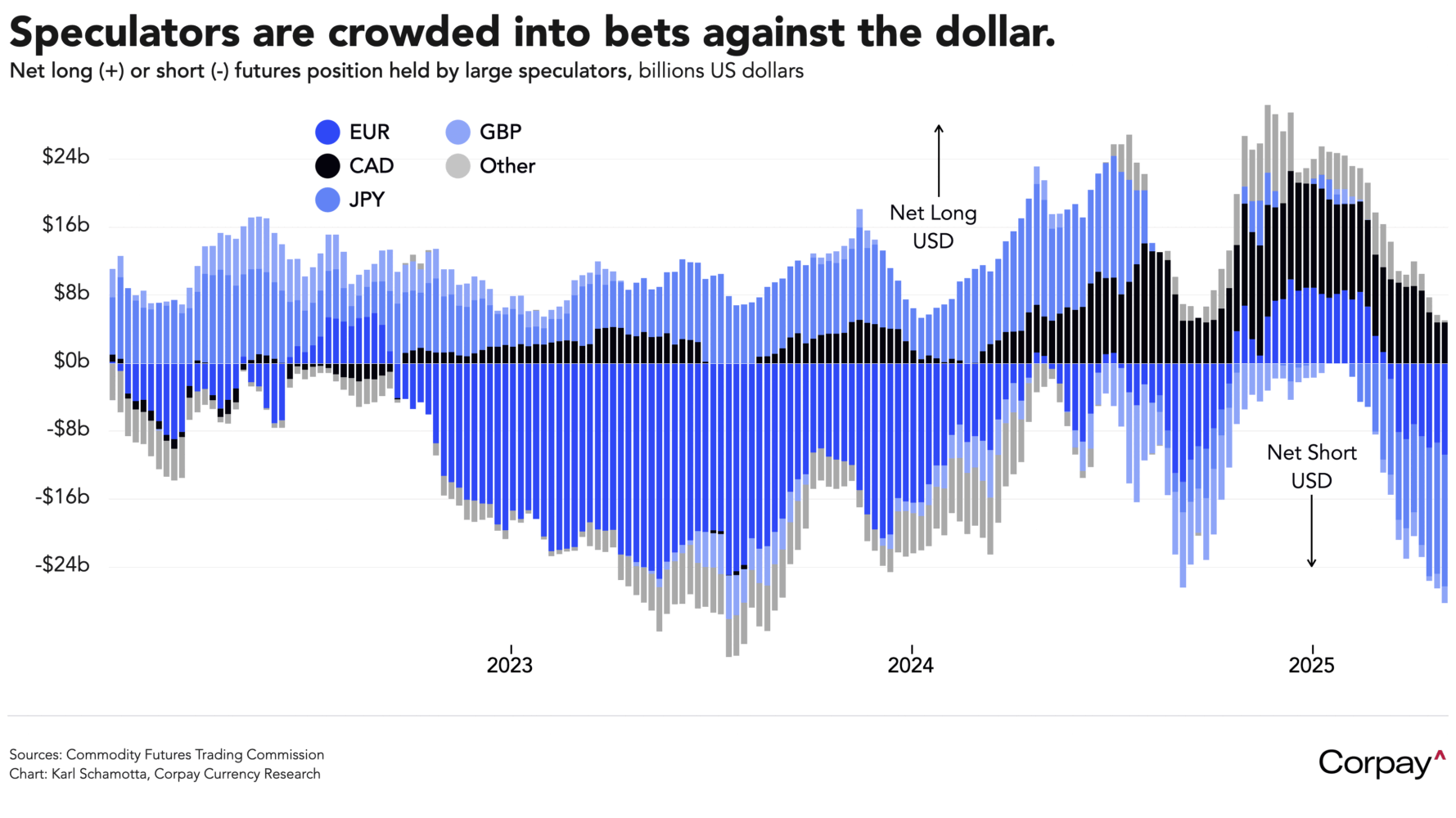 Markets look vulnerable to reversals. The big ramp in speculative bets on the greenback that took place ahead of Donald Trump’s inauguration has been fully unwound, and traders are now crowded into bearish positions – something that in our experience has tended to provide a contrarian signal ahead of a market turn. On the flip side of the equation, Canadian dollar speculators are still sitting on the biggest net short position among the majors, raising the risk of an abrupt punch higher in the event that this week’s meeting between the US president and newly-confirmed prime minister Mark Carney results in trade tensions conclusively ratcheting lower.