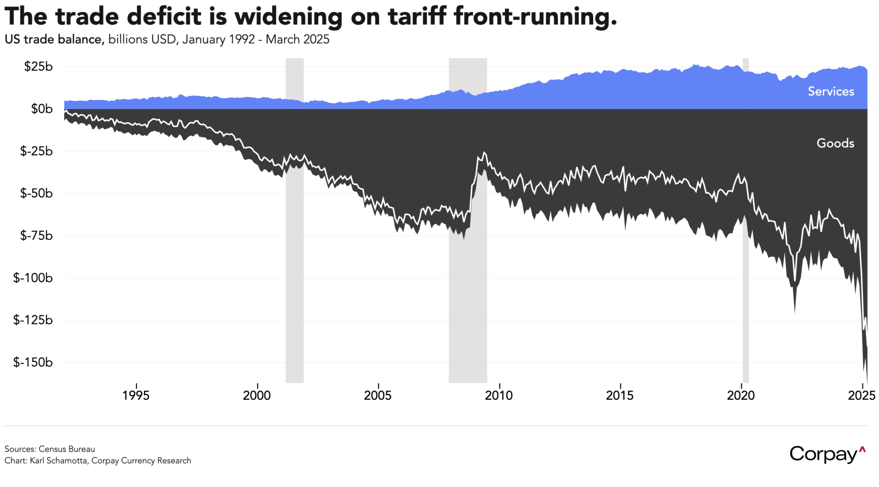 Data out this morning showed the country’s trade deficit exploding in March as companies rushed to import goods ahead of tariffs. According to the Census Bureau, the goods and services trade balance jumped 14 percent to $140.5 billion from $123.2 billion in the prior month, with imports climbing 4.4 percent while exports rose just 0.2 percent. Statisticians noted that consumer goods saw the biggest increase on record, but automobiles and capital equipment also surged on aggressive inventory-building efforts across the economy. This is not expected to continue: shipping volumes are down drastically across American ports, suggesting that higher import taxes are slowing new orders.