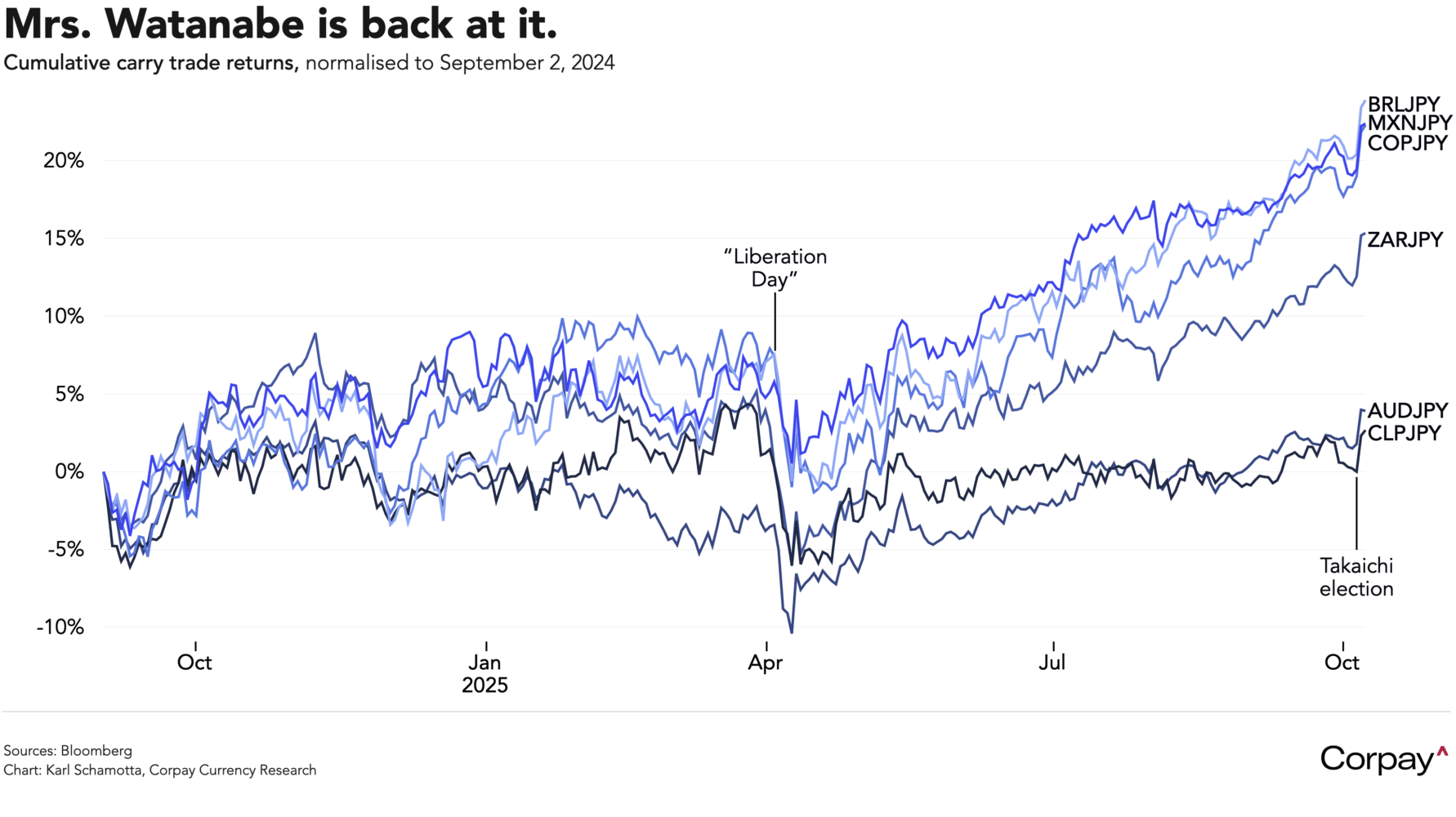 The implications of Sanae Takaichi’s unexpected victory in Japan’s leadership election are still rippling across financial markets. With the incoming prime minister expected to double down on Shinzo Abe’s “Abenomics” monetary and fiscal easing policies, investors are bidding up Japanese equities, selling long-term bonds, and bailing out of the yen, driving it to a -2.2-percent loss over the last two trading sessions. We think Takaichi’s room for manoeuvre will prove far more limited than markets expect, but swap-implied odds on a rate hike at the Bank of Japan’s October meeting have fallen to 23 percent from 57 percent on Friday, and rate differentials are widening against the currency once again, putting renewed impetus behind the carry trade.