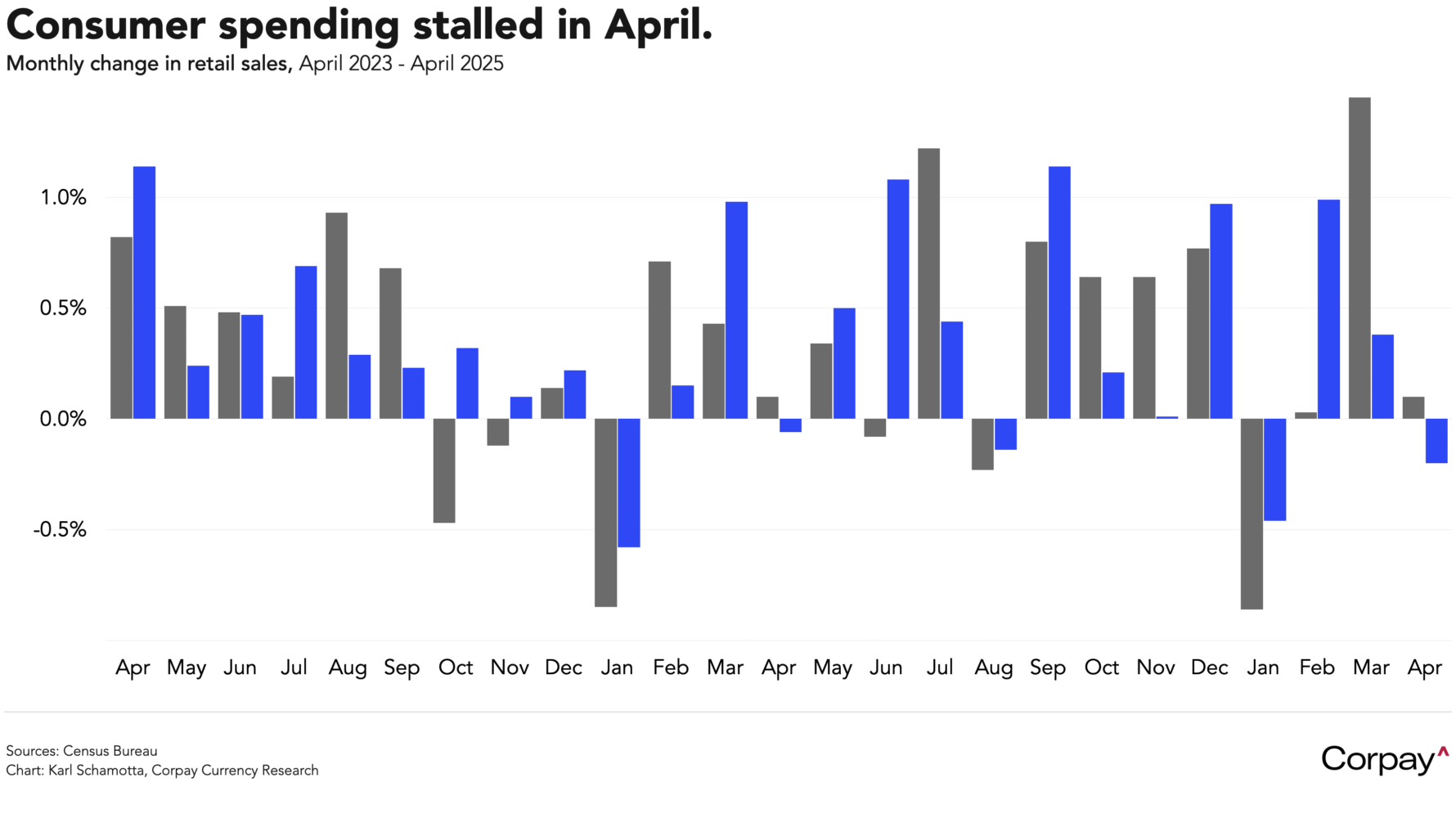 American consumers turned more cautious in April, suggesting that a dramatic deterioration in confidence levels is beginning to translate into weaker spending. Data published by the Census Bureau this morning showed headline retail sales rising just 0.1 percent last month, down from a revised 1.7 percent in March as tariff front-running effects lost steam . “Control group” receipts – which exclude sales by auto dealers, building materials stores, gas stations, office supply distributors, and other more volatile distribution channels – fell -0.2 percent on the month. Economists expect shopping volumes to fall further in the months ahead, given that consumer sentiment is plumbing recession-like lows, and year-ahead inflation expectations are at the highest levels since 1981.