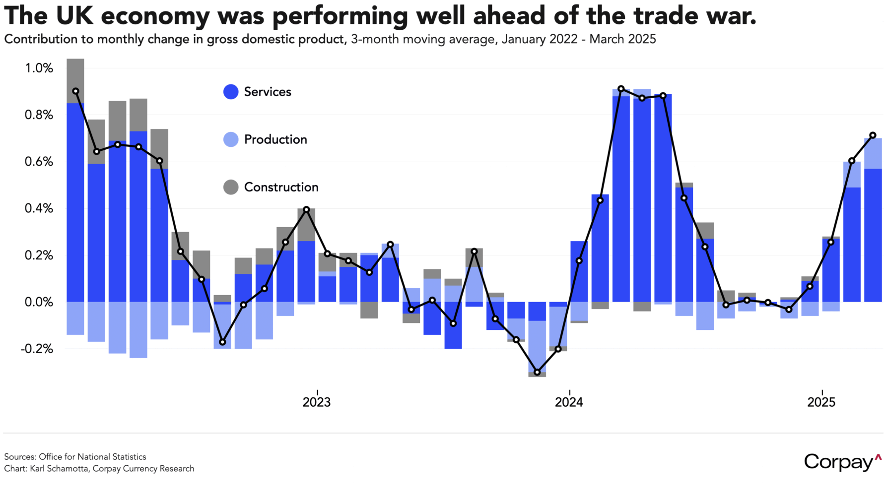 Data released earlier in the session showed the British economy accelerating in the first quarter, just before US tariffs hit. Gross domestic product expanded 0.7 percent in the three months ended in March, mostly powered by a bigger-than-expected jump in services-sector activity. Net trade – potentially boosted by tariff front-running – also delivered a positive contribution. But this strength isn’t expected to last: household consumption remains weak, and elevated levels of trade-related uncertainty are likely to take a toll on business investment in the months ahead. Market participants still see the Bank of England delivering at least two rate cuts in the months ahead, and the pound is struggling to build on its early-year gains.