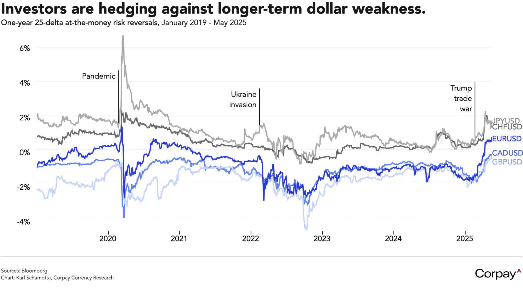 From a broader perspective, currency markets are trading as if an acute threat to the US economy and dollar-denominated assets has faded, only to be replaced with a chronic one. After more than 50 changes in tariffs thus far this year, it appears that a series of adverse market reactions has led to a more careful tone from the Trump administration, but the fact remains: import taxes and uncertainty levels remain at historic highs, setting the stage for weaker economic performance in the months and years ahead. Volatility assumptions are ratcheting lower, and real-money investors aren’t taking outright bearish views on US growth or the dollar, but they are shifting asset allocations toward global markets in anticipation of a slow erosion in the economy’s exceptional status relative to its major counterparts. Risk reversals* – which measure the cost of insuring against a drop in the greenback relative to other major currencies – have risen, with traders hedging against a negatively-skewed distribution of outcomes for the dollar in the year ahead, while also taking a more positive view on the euro.