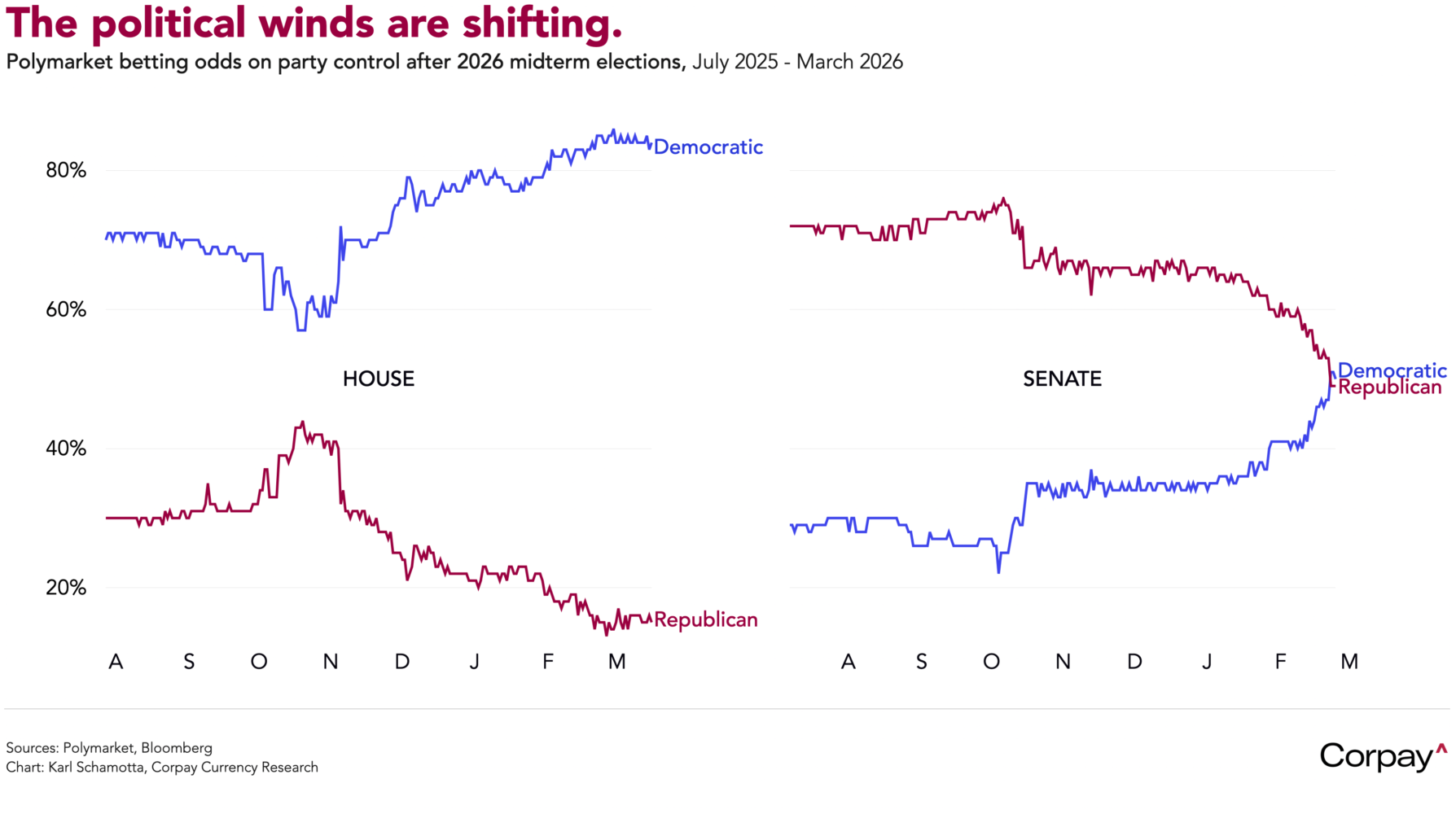 Investors are growing increasingly confident that the Trump administration is looking for an exit—and a way to declare victory. Allies and domestic politics have turned decisively against the conflict. Despite weekend threats, Japan, Germany, and most Nato allies have refused to join a naval flotilla to reopen the Strait, favouring diplomatic channels instead. At home, the war has failed to produce the rally-round-the-flag effect seen in previous conflicts and is deeply unpopular, widely viewed as worsening the affordability crisis facing American households. Prediction markets now point to Democrats taking both the House and the Senate in November, raising the prospect of impeachment proceedings and compounding the political pressure on the president to dial the conflict down.