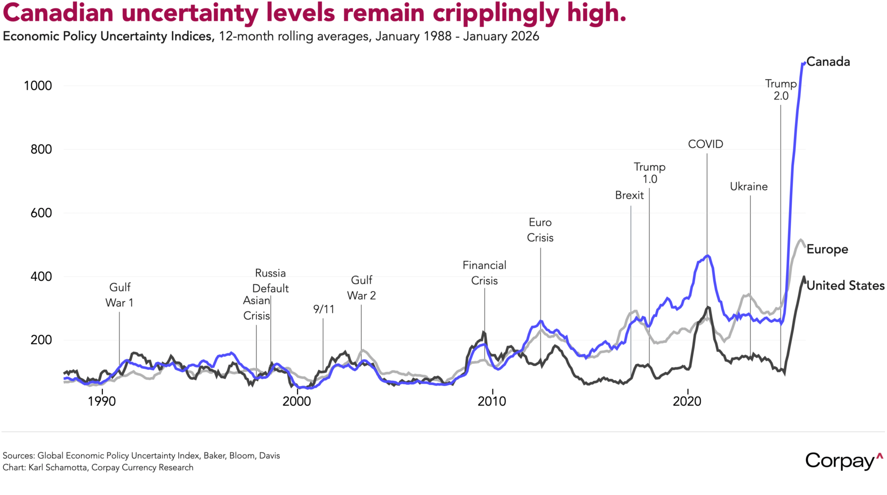 The Canadian dollar remains narrowly rangebound after yesterday’s inflation figures failed to alter expectations for the Bank of Canada to keep rates on hold for the rest of the year. After delivering an aggressive 200 basis points in easing over the last two years, the Bank has landed near what Governor Tiff Macklem calls “about the right level,” and overnight index swaps are pointing to no movement in policy settings in 2026. The logic reflects offsetting forces: idiosyncratic factors are keeping inflation near target even as trade policy changes and an ongoing housing-market downturn weigh on activity, making tightening hard to justify. Sentiment has improved modestly, but uncertainty levels in Canada remain far above global peers, supporting an extended pause.
