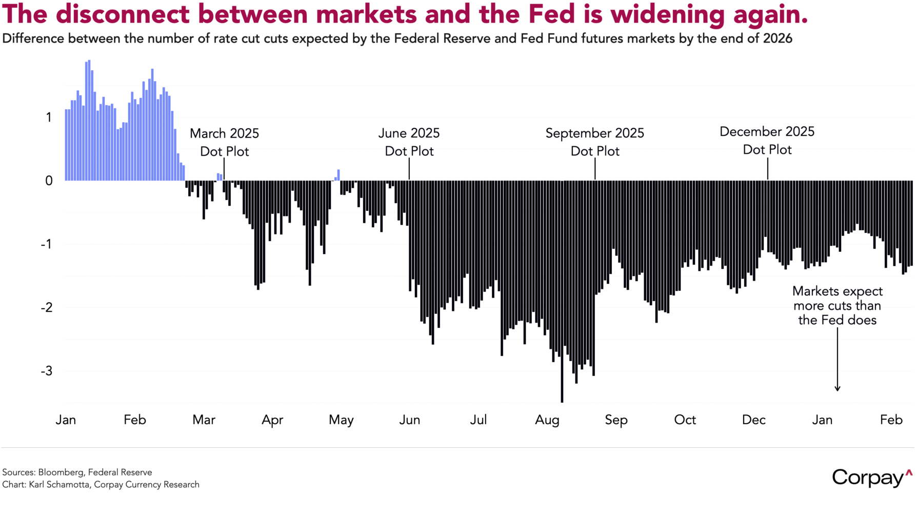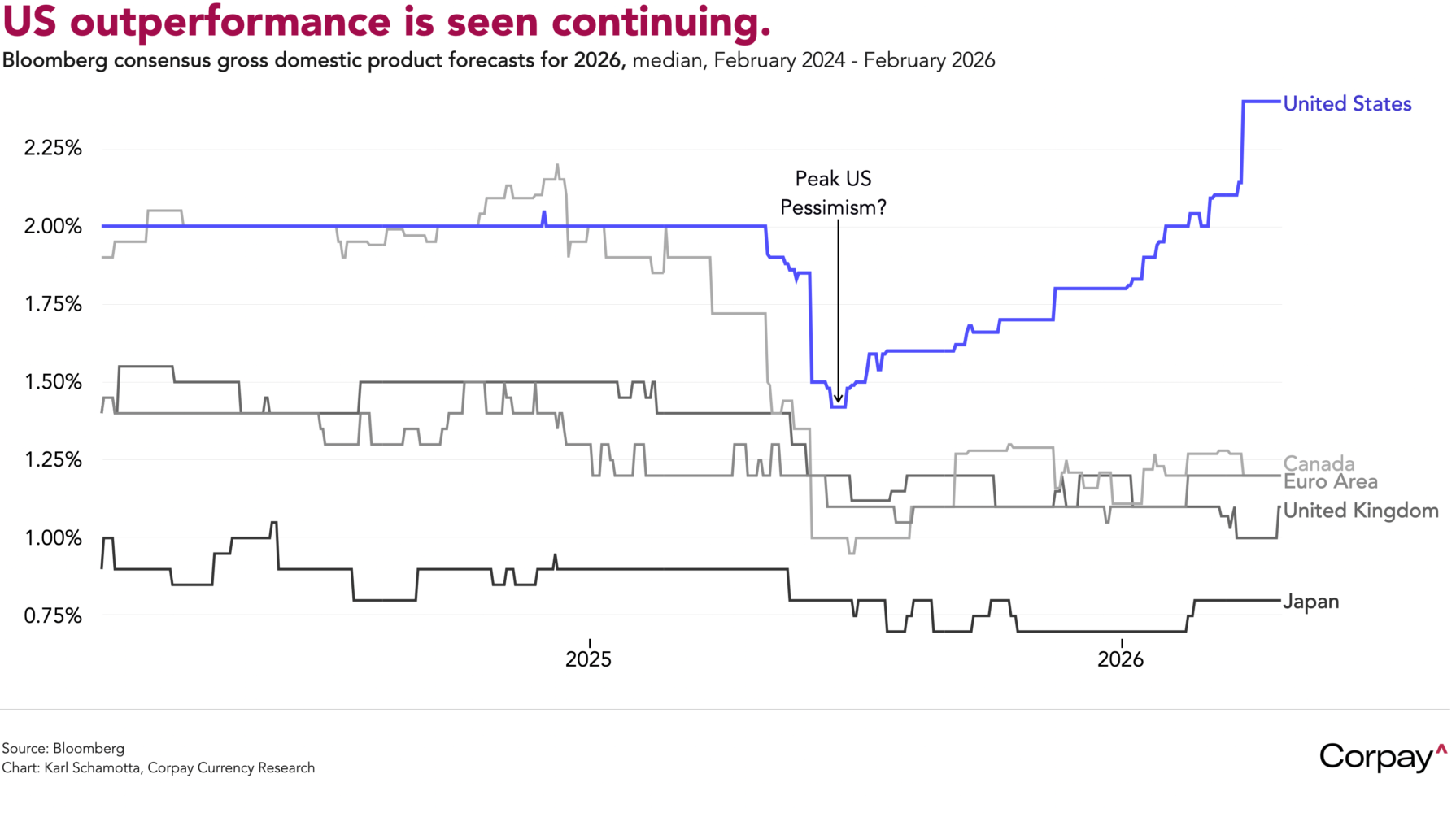 Against this backdrop, we’re struggling to see the case for a dollar-bearish narrowing in cross-currency rate differentials. While US exceptionalism may fade over time, the near-term backdrop remains favourable: inflation is easing, labour markets are holding up and growth is still strong. Tailwinds could build as tax refunds arrive, uncertainty recedes and business investment firms. Consensus is gradually shifting toward another year of US outperformance, and a comparable improvement elsewhere is harder to identify. At some point, that should support a hawkish repricing in the dollar.