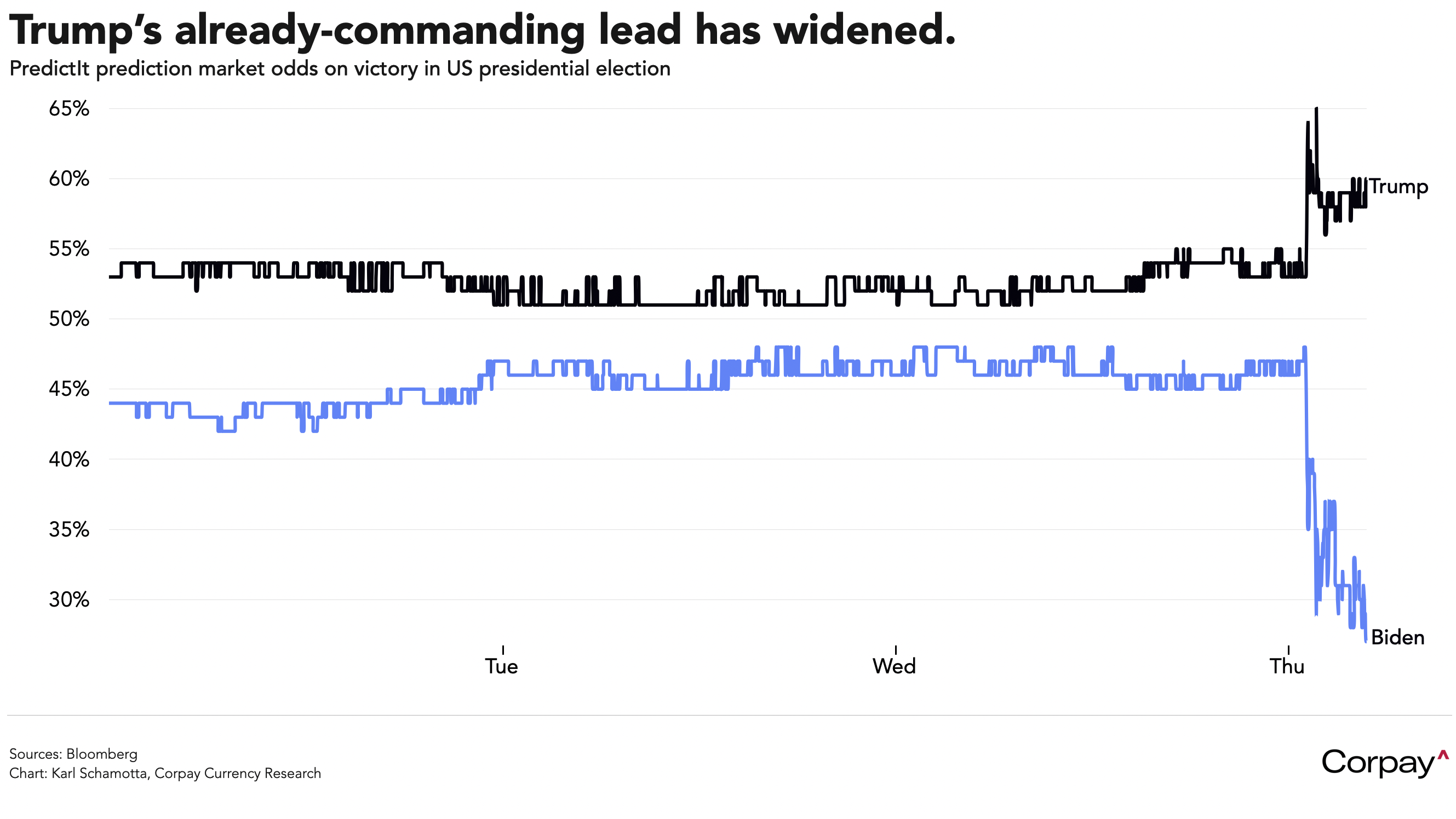 The latest in a series of market-moving political upsets came last night when President Biden turned in a disastrous performance in a televised debate, inviting questions from Democratic officials as to whether he should remain in the race. Struggling to counter a confident and falsehood-spewing Donald Trump, Biden’s weak speaking cadence, confusion on important data points, and meandering responses triggered a collapse in betting odds, with prediction markets pointing to a 15-point decline in the likelihood of securing a second term. Yields rose and the dollar climbed against the Mexican peso, Canadian dollar and euro as market participants positioned for lower corporate taxes and more difficult relationships with major US trading partners.