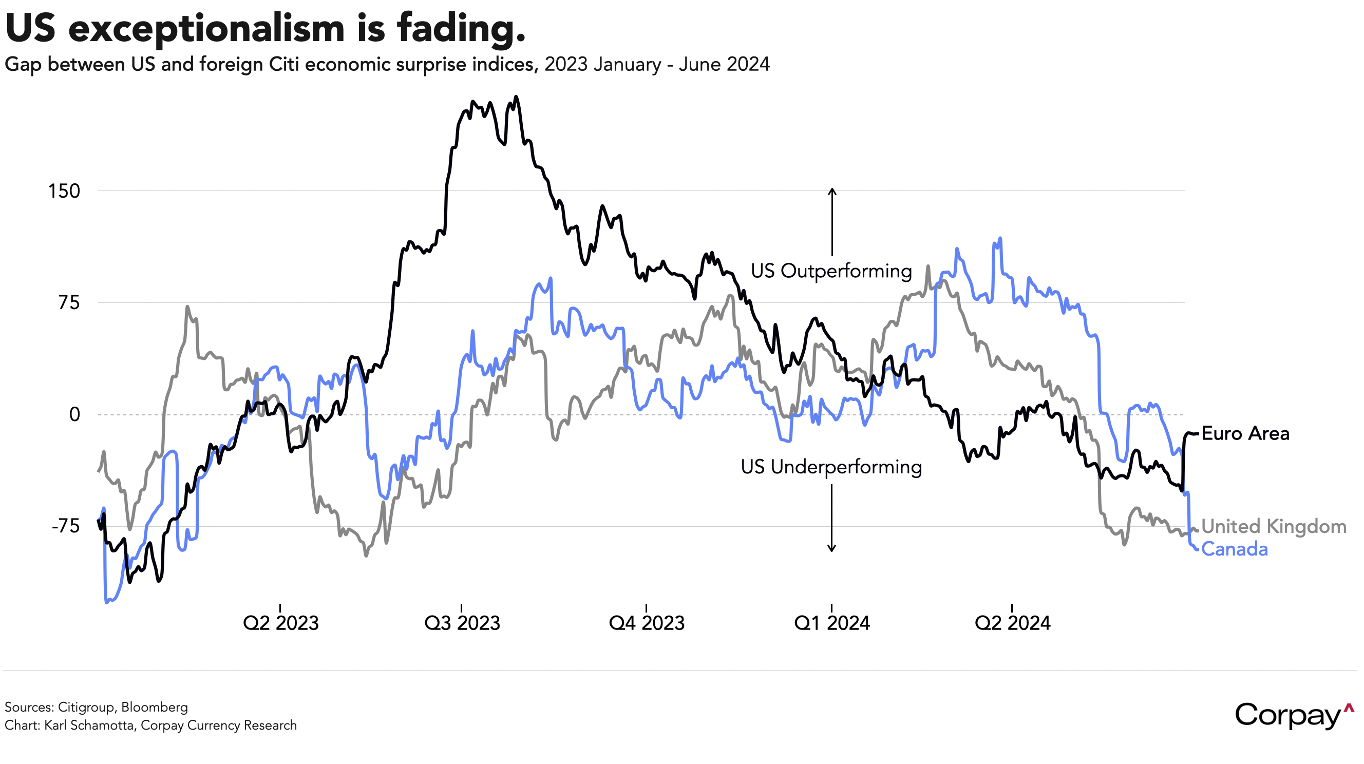 More broadly, the US economy is showing clear signs of slowing momentum. Data out yesterday showed core durable goods orders moving into contraction, and the number of people on unemployment benefits rose by more than expected, pointing to stronger headwinds ahead for real growth. The gap between economic surprise indices – which measure differences between economist forecasts and realised results – in the United States and other major economies has moved deeper into negative territory, helping further deflate the “US exceptionalism” trade that animated markets through much of the last two years.