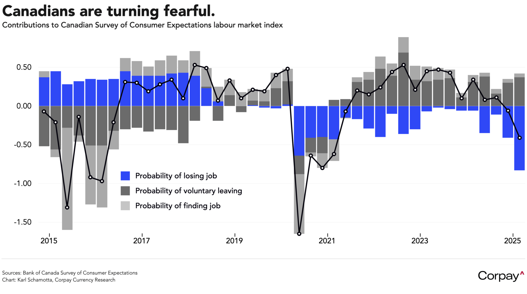 The Canadian dollar continues to inch higher, despite new data showing that businesses and consumers are turning more cautious. According to the Bank of Canada’s latest set of surveys, published yesterday, inflation expectations have risen, but economic sentiment has deteriorated even more sharply, leading businesses to delay investment and hiring decisions, and driving consumers to pull back on buying plans. The share of companies that now expect a recession in the coming year has more than doubled to 32 percent, and the Bank’s measure of labour market confidence shows more Canadians are worried about losing their jobs** than during the peak of the pandemic in 2020. This comes after the US applied 25 percent levies on auto, steel, and aluminum imports from Canada, and vacillated on imposing similar taxes on goods that are part of the Canada-US-Mexico trade agreement.