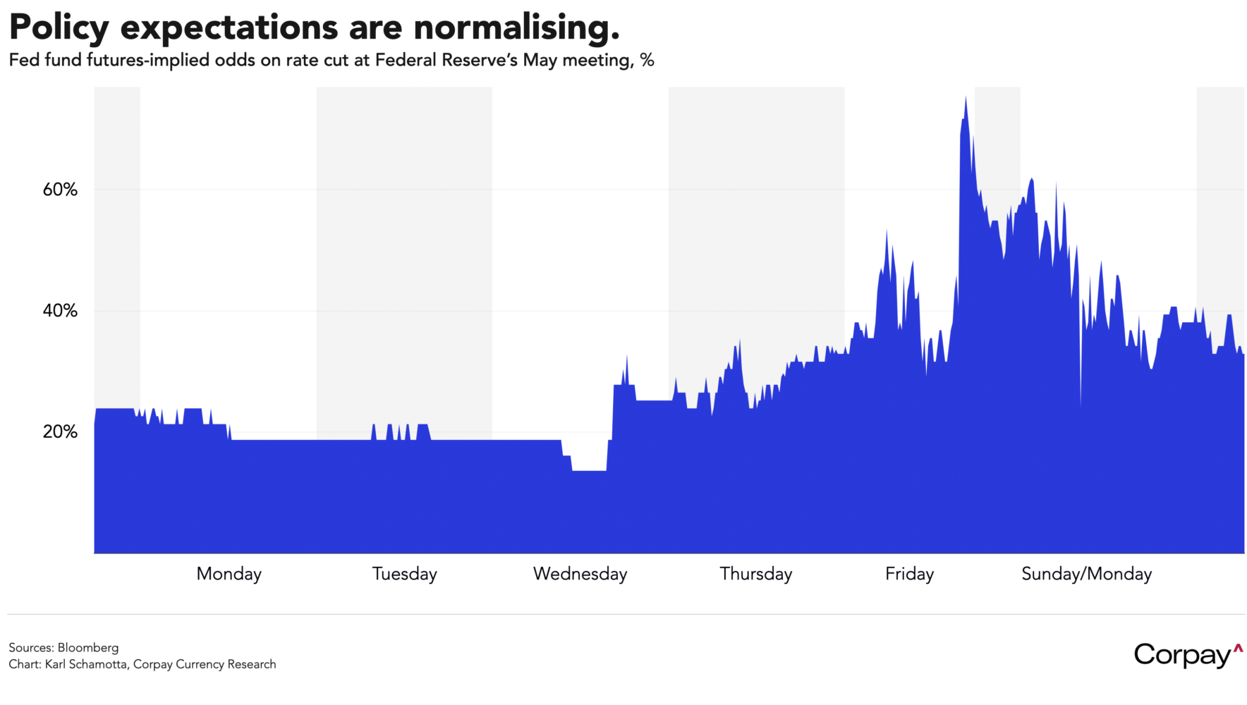 A fragile sense of calm is returning. Currency market trading ranges are narrowing as participants anticipate a pivot from the Trump administration, and the VIX volatility index—known as Wall Street’s “fear gauge”—is reverting lower after pushing above the 60 threshold early in yesterday’s session. Movements in Treasury markets are stabilising somewhat, and the futures-implied likelihood of a rate cut at next month’s Federal Reserve meeting are back to just above 30 percent, down from almost 80 percent.