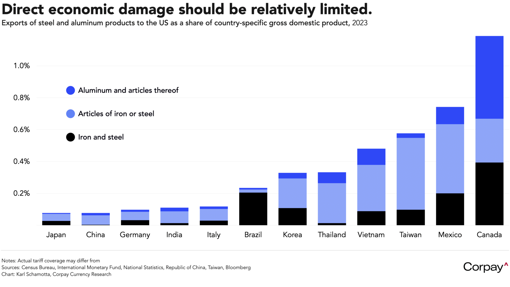 We don’t expect this round of tariffs to hit any economy particularly hard. Psychological effects could be substantially larger, but steel and aluminum exports make up a relatively-small share of gross domestic product in most countries, and aren’t likely to shift dramatically in response to an increase in US import prices. The focus on countries like Canada and Mexico is interesting, however, in the sense that it exposes something about Donald Trump’s approach to geopolitics: he has, again, chosen to hit close allies of the United States far harder than any of the country’s traditional adversaries, reversing Republican orthodoxy going back to Reagan and beyond. The global order seems to have been turned on its head.