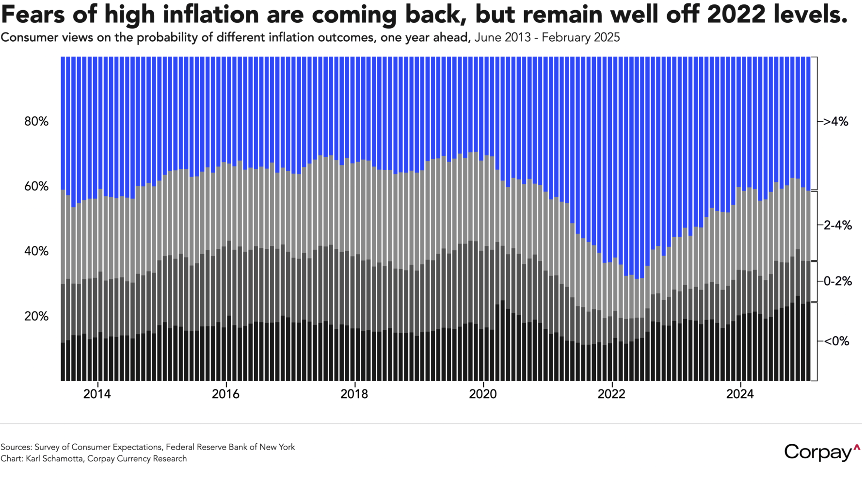 To wit, consumers may be less fearful than we suggested yesterday morning: the New York Fed’s survey of consumer expectations for inflation at the one-year horizon were unchanged in January at 3 percent, countering Friday’s University of Michigan survey, which showed a sharp rise in median price forecasts: perhaps illustrating methodological differences that reduce partisan bias. A measure which captures the probability of various inflation outcomes—distinguishing between deflation, inflation between 0 and 2 percent, between 2 and 4 percent, and over 4 percent—shows households becoming slightly more worried about a resurgence in price growth than they were in the late autumn, but nowhere near the levels reached in early 2022.
