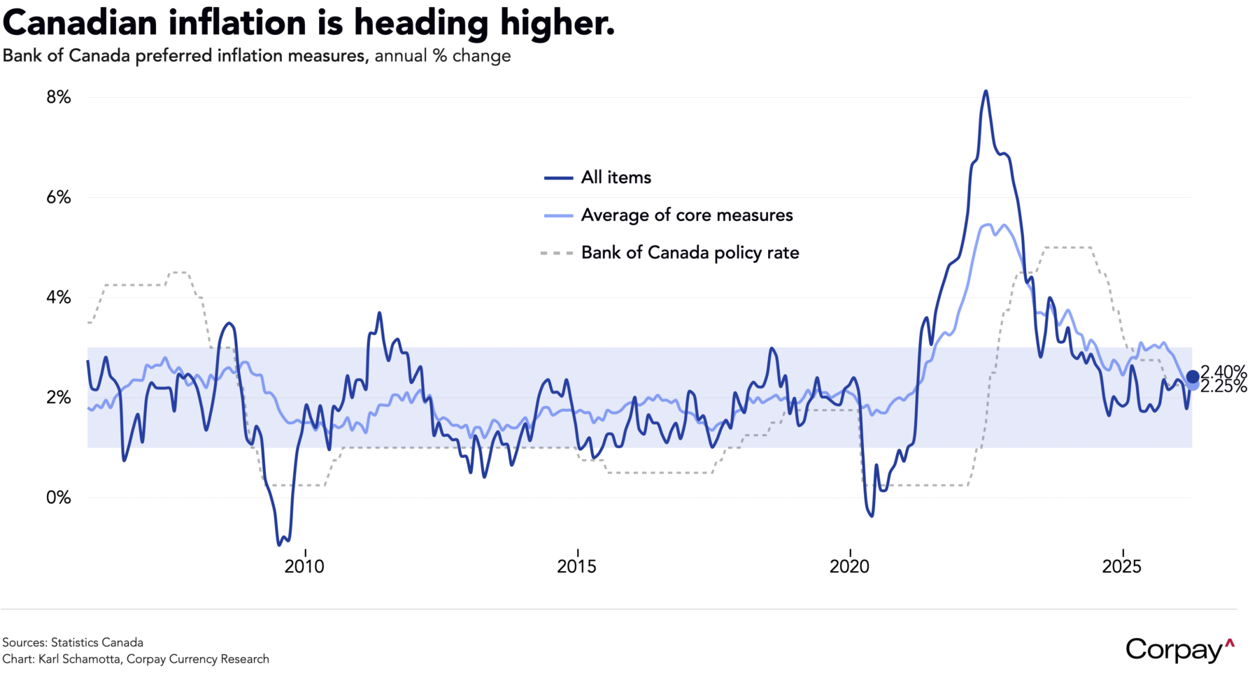 Here in Canada’s frozen wastelands**, inflation pressures intensified slightly less than feared last month, reinforcing the case for a patient approach from the Bank of Canada. Data released by Statistics Canada this morning showed the headline consumer price index climbing 2.4% on a year-over-year basis in March, accelerating from the 1.8% gain increase recorded in February on a 21.2% jump in gasoline prices—but missing the 2.6% expected in markets. Core inflation—which strips out food and energy prices—and is computed as the average of the two price measures now preferred by the Bank of Canada (trim and median), increased 2.25% over the same period last year, down from 2.30% in the prior month. Swap-implied odds on one rate hike by year end are slipping, reflecting hopes the Bank will prove willing to follow its long-standing playbook in “looking through” changes in volatile commodity prices as it sets policy.