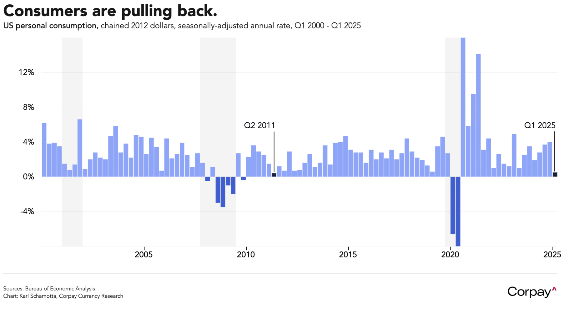 Households suffered a hit to income growth and became more cautious spenders in the month, suggesting that the Trump administration’s economic policies began to impact the growth outlook. Personal income tumbled -0.4 percent month-over-month as government transfers fell, and inflation-adjusted household spending fell -0.1 percent, with both missing forecasts that had been set at 0.3 percent and 0.1 percent, respectively. This followed yesterday’s third revision to the first quarter’s gross domestic product reading, which showed consumer spending growing at the weakest pace since the pandemic, adding to negative trade effects in driving the economy into a downwardly-revised -0.5-percent contraction.
