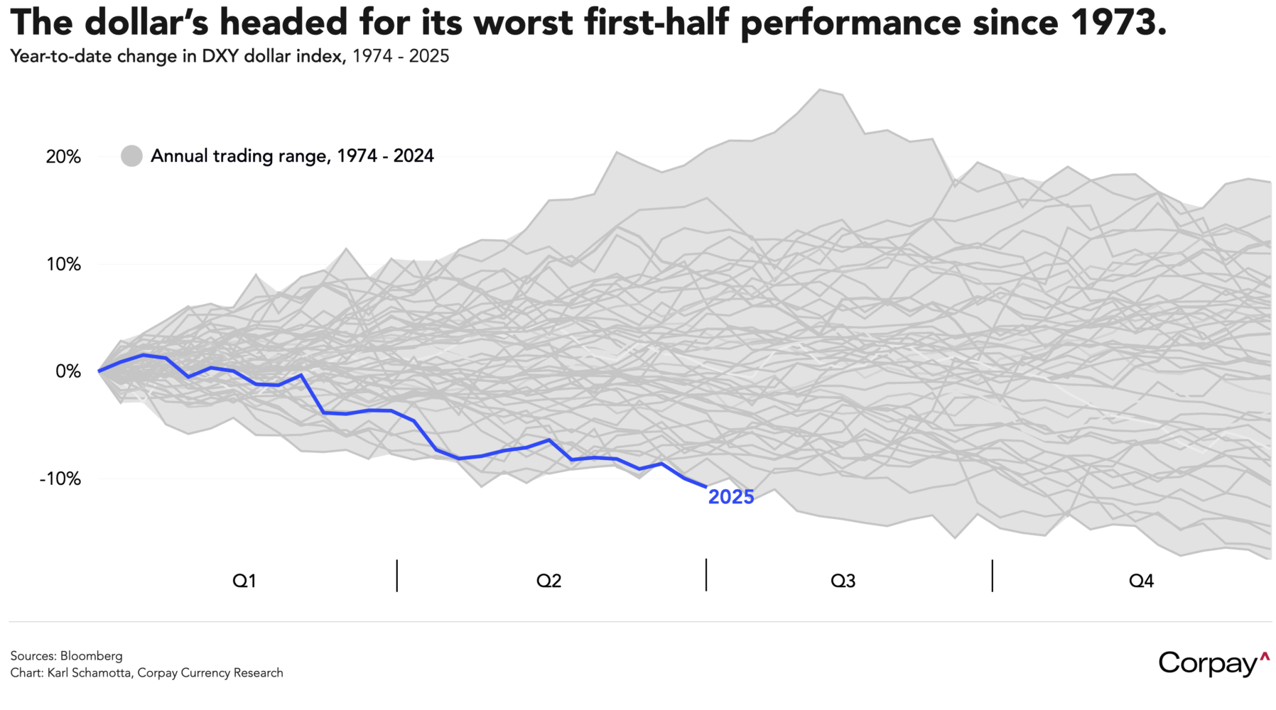 Unless there’s a bounceback by Monday, the dollar looks set to end the first half with its worst performance since the Bretton Woods fixed exchange-rate system collapsed in 1973. The DXY dollar index is down 10.4 percent year to date as global investors downgrade expectations for the American economy, worry about the country’s fiscal outlook, and reallocate capital into other jurisdictions. We suspect this has gone a little too far in the short term—rate differentials seem likely to play a more supportive role in the months ahead—but there’s no doubt that the headwinds facing the dollar over the long term have grown substantially stronger, suggesting that once-durable currency trading relationships could remain absent for a prolonged period of time.