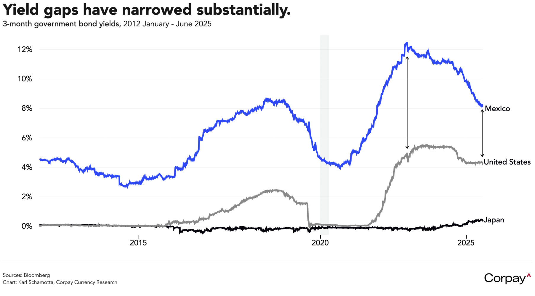 After eight consecutive rate reductions, the gap between US and Mexican policy rates has narrowed, but the currency remains an attractive outlet for the “carry trade”—in which investors borrow in low-yielding currencies to invest in high-yielders—meaning that it could have further upside potential against a subsiding volatility backdrop in the near term. The outlook looks cloudy however, with the country’s deep vulnerability to changes in US trade policy and remittance flows representing a serious downside risk. We suspect the exchange rate will begin to lose altitude once again as the autumn months approach.