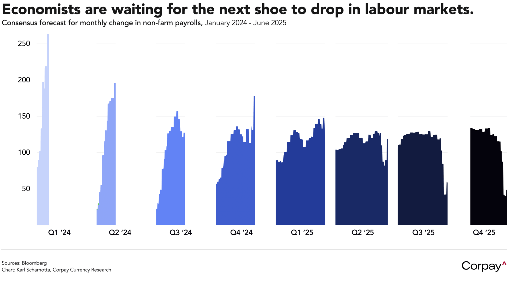 The dollar is inching off a two-year low as investors adopt a defensive posture ahead of this morning’s Job Openings and Labor Turnover report, which is expected to confirm a cooling in US labour market conditions ahead of Friday’s non-farm payrolls report. Mentions of layoffs on corporate earnings calls have been minimal, and unemployment claims remain well below levels that have historically signalled growing stress, but economists have drastically lowered job creation forecasts*, and market participants are bracing for an imminent slowdown. Treasury yields are slipping as traders anticipate more easing from the Federal Reserve, North American equity indices are pointing to a dip at the open, and most major currencies are nursing modest losses against the greenback.
