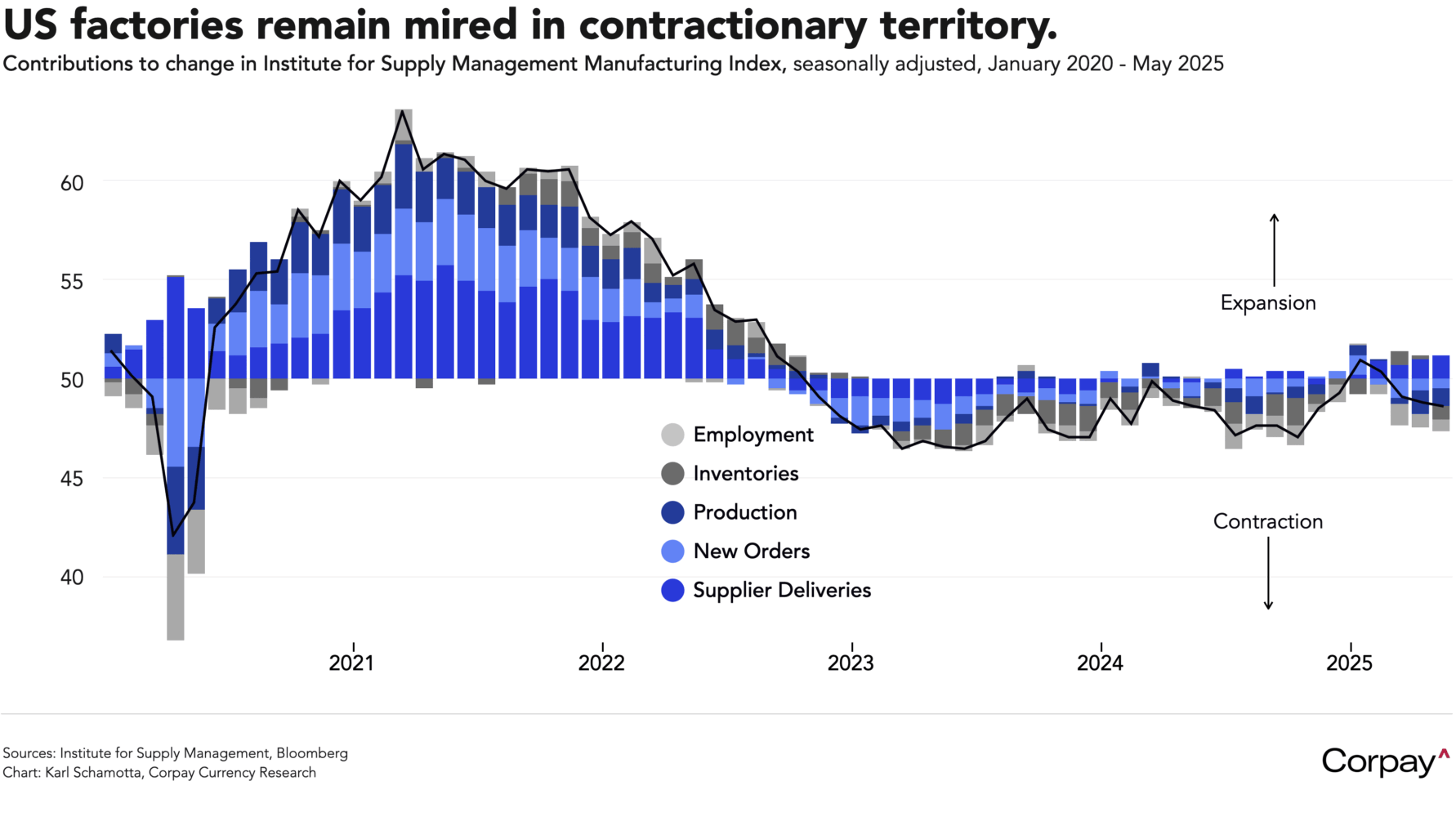 A report published yesterday showed US factory activity slipping further into contractionary territory last month, with respondent comments placing the blame squarely on tariff-related policy changes. The Institute for Supply Management’s manufacturing index slipped to 48.5 in May from 48.7 previously, remaining below the 50 threshold that separates expansion from contraction for a third consecutive month. The imports sub-index fell to the lowest levels recorded since the global financial crisis, inventories slipped, delivery times lengthened, and new export orders dropped at a rate typical of recessions, suggesting that retaliatory measures in other countries took a toll. 86 percent of the survey’s participants mentioned tariffs in their comments, and many drew direct comparisons with the supply chain conditions experienced during global lockdowns in early 2020.