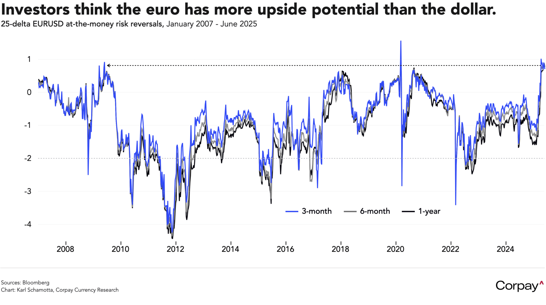 Despite this dovish policy backdrop, options traders haven’t been as optimistic on the euro’s upside potential relative to the dollar since 2007**. Risk reversals—which measure the difference between puts and calls for the same expiries—are skewed toward euro-positive outcomes, and are increasingly skewed over longer time horizons, suggesting that market participants expect gains to accelerate over the year ahead.