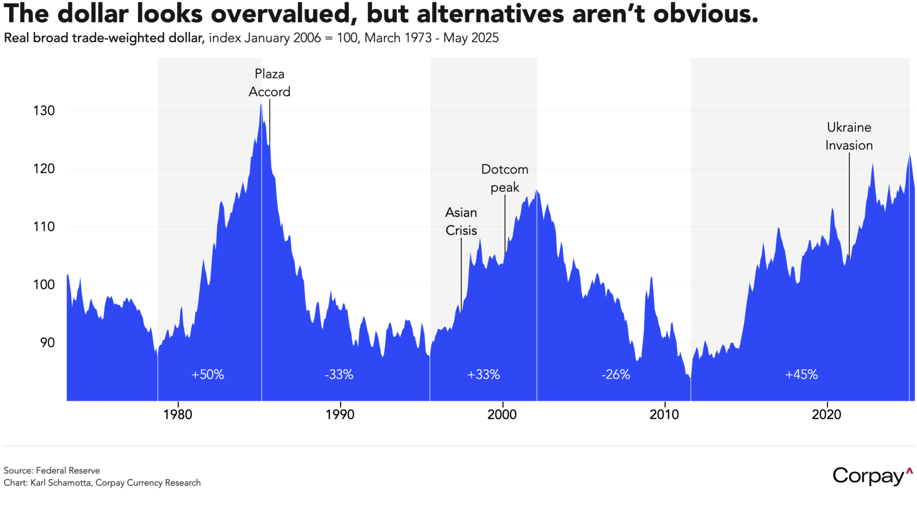 We find this difficult to justify. There are good reasons to think that a narrowing in cross-Atlantic growth differentials and a gradual diversification away from American assets might help correct overvaluation in the dollar in the years ahead, but in the here and now, the euro area is still facing serious structural headwinds. Chronic underinvestment is weighing on productivity growth, while rigid labour markets and an ageing population constrain dynamism. Heavy regulatory burdens slow innovation, and mean that big stimulus efforts—such as Germany’s recent fiscal expansion—can take years to impact growth trajectories. Meanwhile, geopolitical tensions on the bloc’s eastern flank and an overreliance on external demand expose the region to global volatility. There are signs that deeper integration and reform efforts could gain traction—especially if led by former European Central Bank president Mario Draghi—but those are unlikely to reshape fundamentals in the near term, or sustain the repatriation of hundreds of billions in offshore assets. For now, the bloc remains a slow-growth area in an increasingly multipolar world, and the common currency’s upside potential seems limited.