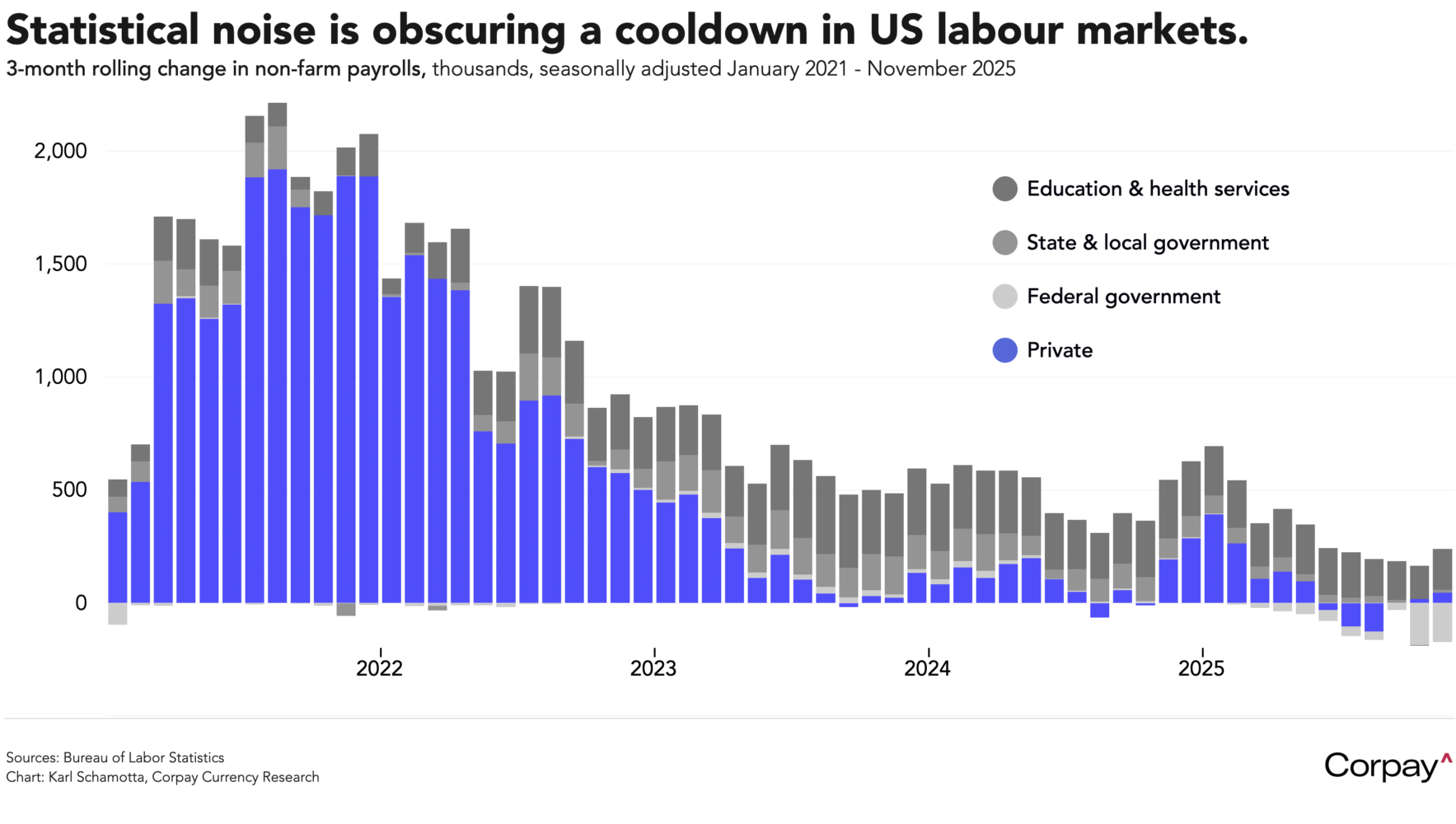 US labour markets continued to cool in October and November, slightly raising market bets on a stepped-up easing campaign from the Federal Reserve next year. According to delayed data just released by the Bureau of Labor Statistics, a total -41,000 jobs were lost over the last two months—representing an undershoot relative to consensus forecasts—while the previous two months were revised lower by a total 33,000 positions, bringing the three-month average pace of job creation to 22,000, down from 62,000 ahead of the update.