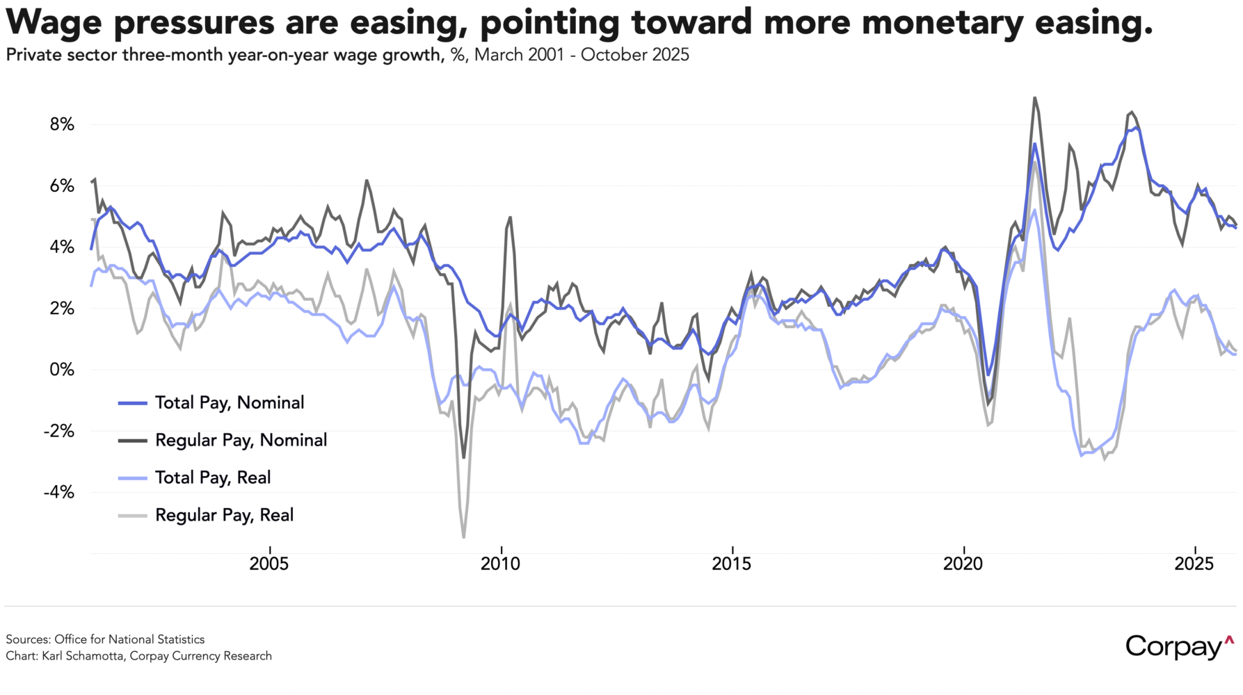 The picture is more clear-cut in the United Kingdom. Odds on a rate cut at Thursday’s Bank of England meeting firmed slightly this morning when the Office for National Statistics said the number of workers on payrolls fell by 38,000 in November, and that regular pay growth in the private sector—the Bank’s preferred measure of underlying wage pressures—fell to 3.9 percent year-over-year in the three months ended in October from 4.2 percent in the prior month. With Governor Bailey now highly likely to vote with his dovish colleagues in favour of easing policy further, odds on a move are holding above 90 percent, and the pound is struggling to match the gains enjoyed by its counterparts.