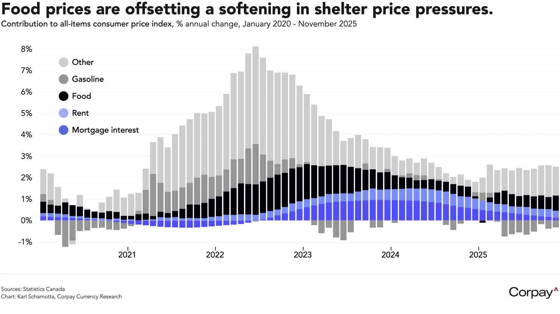 The Canadian dollar is adding to its gains after data published yesterday showed consumer prices remaining broadly stable last month, keeping the Bank of Canada sidelined for now. According to Statistics Canada, underlying core inflation subsided to 2.8 percent in the year to November—down from 3 percent in the prior month—while the headline measure stayed at 2.2 percent for a second month. Food prices—up an astonishing 4.7 percent— offset a continued softening in shelter-related categories, but are typically considered outside a central bank’s remit, given that they are heavily driven by supply-side dynamics. Market-implied expectations for a hike by next October are holding firm.
