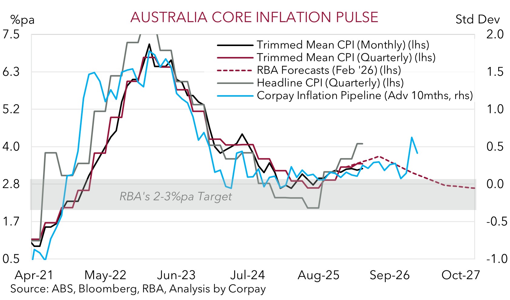 Given the push/pull domestic and global forces at work we expect more bursts of AUD volatility over the period ahead. On net, we believe the strong inflation/rising RBA interest rate narrative is a ‘known known’ and largely baked into the AUD. However, we don’t feel the looming growth hit from petrol prices and interest rates has been accounted for. Neither have the global growth headwinds generated by the Middle East conflict and spillover effects on supply-chains, particularly on activity across Asia. This backdrop, combined with the upswing in US interest rates and higher oil prices (given the US’ shift to becoming a ‘net energy exporter’) could weigh on the AUD, especially as it is tracking ~1.5-2.0% above our ‘fair value’ estimates and positioning (as measured by CFTC futures) is ‘net long’.