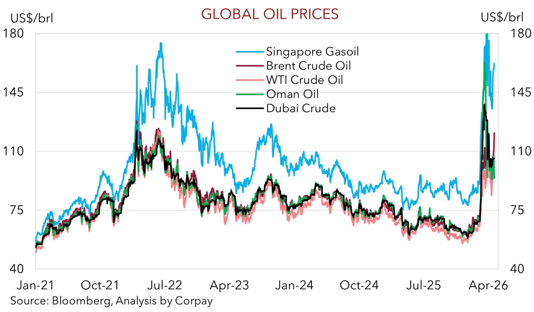 A few renewed wobbles across markets overnight as a mix of factors rattled nerves. European equities lost ground (EuroStoxx600 -0.6%) and the major US indices tread water, while bond yields rose with US rates climbing ~8-11bps across the curve. Elsewhere, the USD edged up with EUR (now ~$1.1675) and GBP (now ~$1.3474) slipping back and USD/JPY edging over ~160. Cyclical currencies like the NZD (now ~$0.5829) and AUD (now ~$0.7115) underperformed with both shedding ~1%. Oil prices jumped with brent crude climbing ~9.5% to be up around US$118/brl, not that far from its recent conflict peak.