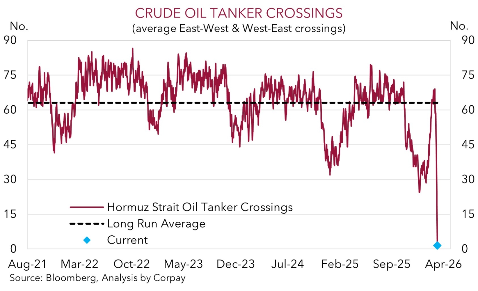 It was a negative end to a rather torrid week for markets on Friday. Developments in the Middle East and oil prices remain front of mind, while a weaker than anticipated US jobs report and tepid retail sales compounded investor nervousness. Oil prices jumped again with Brent Crude tracking near ~US$94/brl. This is a high since Q3 2023 and ~58% above the mid-December low. As mentioned before, higher oil prices are generating fears of a simultaneous growth slowdown (higher fuel prices act like a tax) and inflation jolt. Worries about ‘stagflation’ aren’t typically a great environment for risk assets. As our chart below shows, on our figuring, traders are (finally) factoring in a supply premium in oil. Key Middle East oil producers such as the UAE, Kuwait and Iraq are slowing production. This is because storage capacity is running out due to the Strait of Hormuz, the vital shipping lane in the region, effectively being shut. As the second chart illustrates, container crossings have dropped to near zero. Given the regional situation shows no real signs of improvement, oil prices may move even higher in the near-term.
