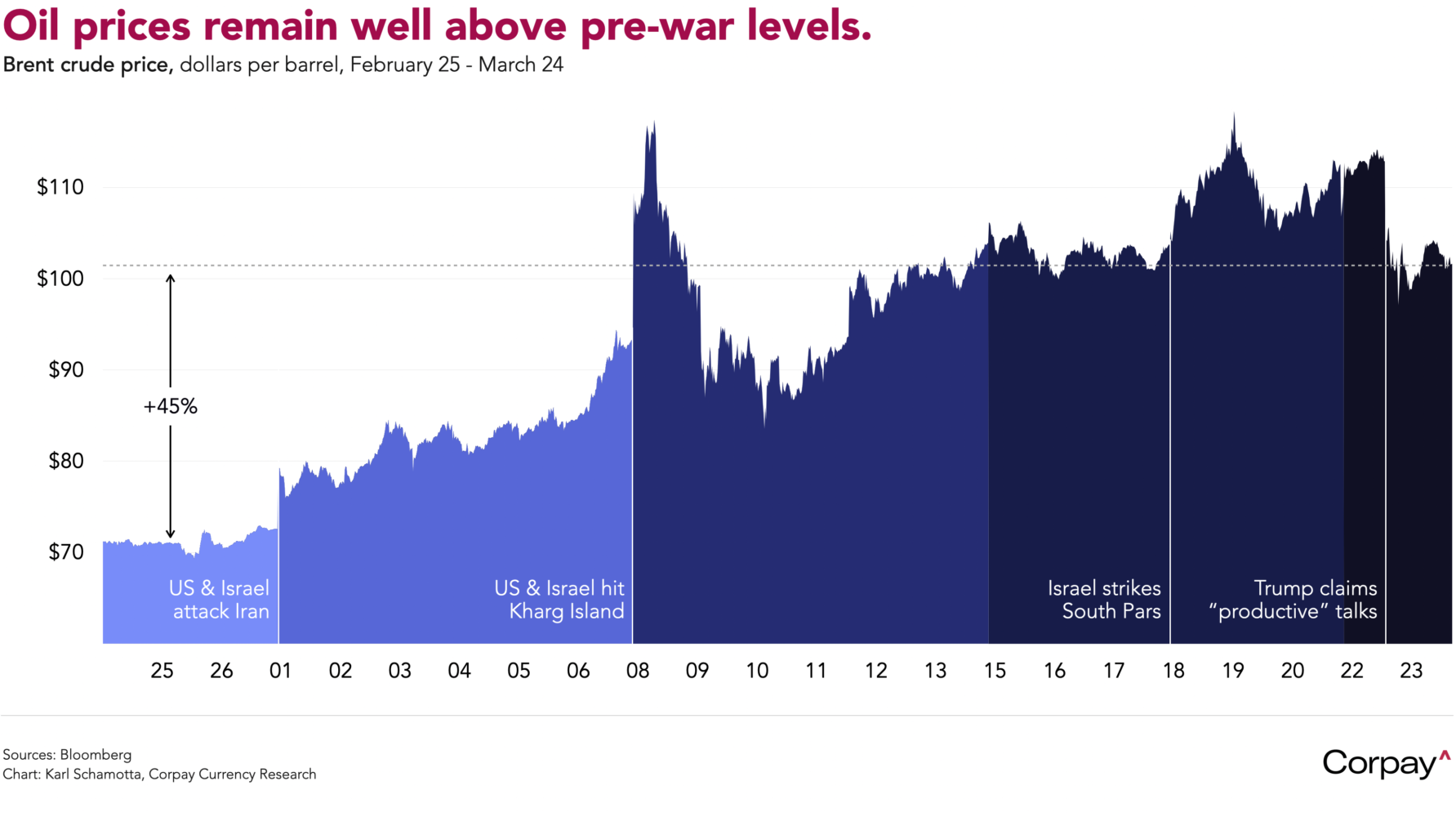 Energy prices are ratcheting higher once again as fighting in the Middle East rages unabated, suggesting that President Donald Trump’s efforts to find a diplomatic off-ramp have not met with success thus far. Brent crude is trading above $100 a barrel, West Texas Intermediate is clinging to the $90 threshold, and European gas benchmarks are climbing, reversing yesterday’s retreat* which came after the president claimed “productive discussions” were underway to end the conflict—only to be contradicted by Iranian officials later in the day**. This morning, Treasury yields are little changed, equity futures are pointing to modest gains at the North American open, and the dollar is inching higher amid a slow-motion flight to safety. The Canadian dollar is back to levels that prevailed ahead of yesterday’s surge in optimism.