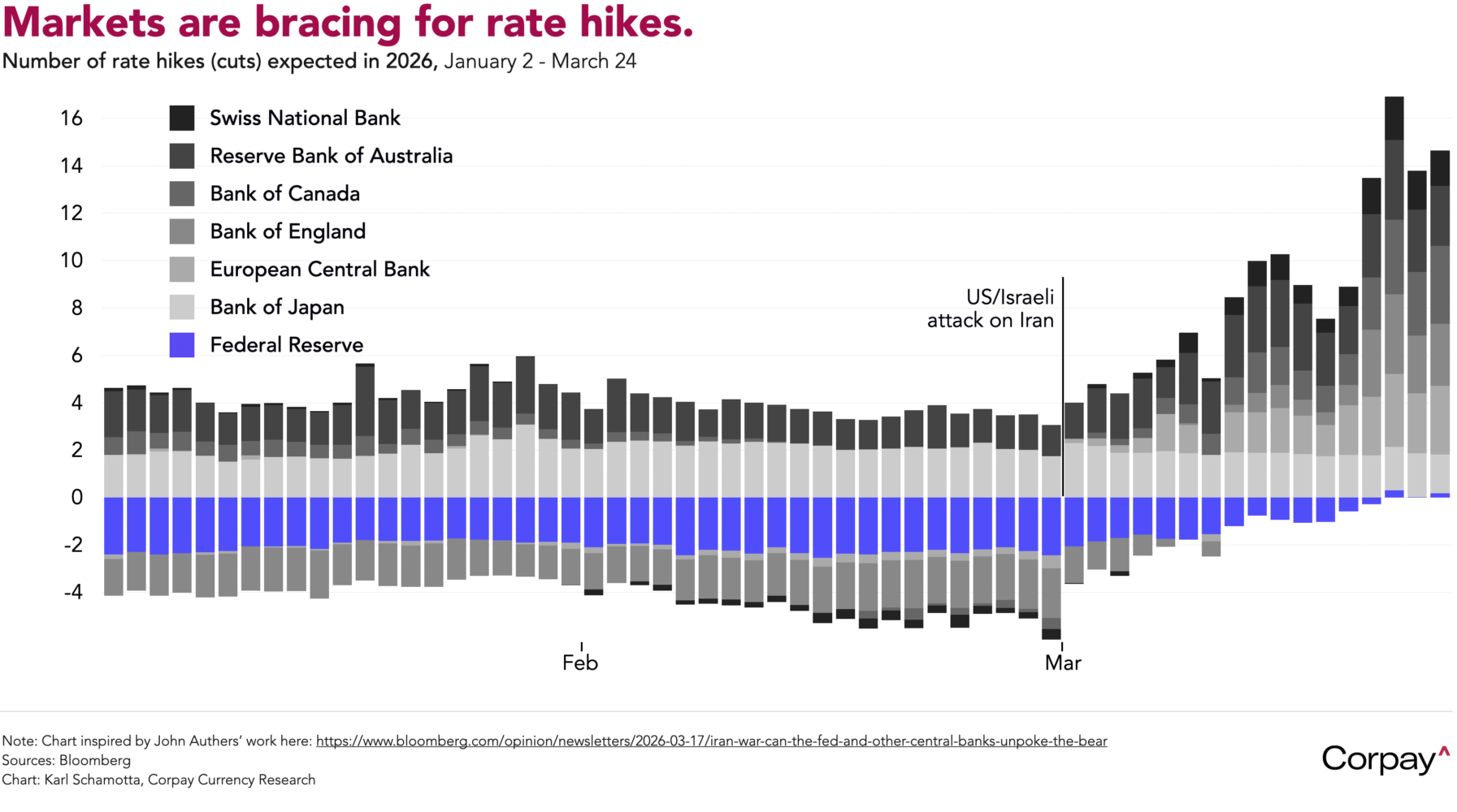 ***This method for showing global rate pricing was inspired by John Authers’ work here: https://www.bloomberg.com/opinion/newsletters/2026-03-17/iran-war-can-the-fed-and-other-central-banks-unpoke-the-bear