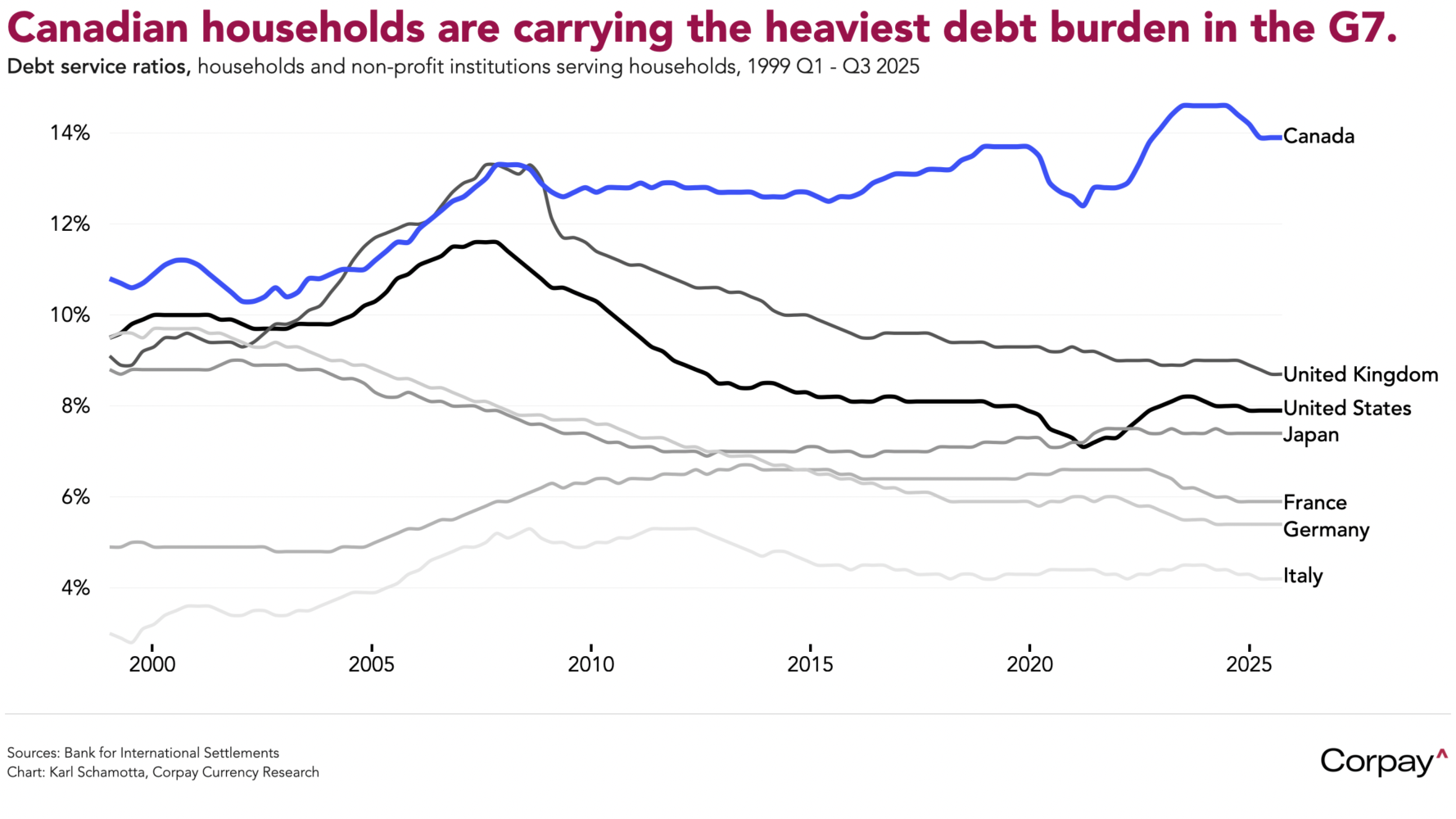 **Note that the “debt service ratio”—the share of household disposable income devoted to servicing outstanding debt—used here is based on the Bank for International Settlements’ internationally-consistent methodology, not the Statistics Canada series more commonly deployed in Canadian economic analysis.