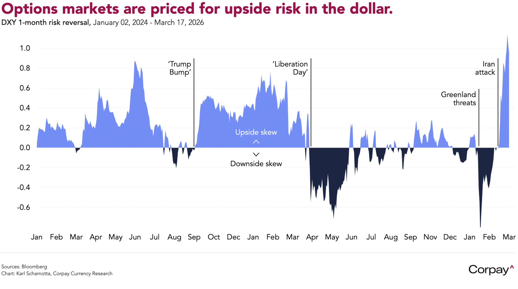 In practice, signs of a more hawkish bias could emerge, with Chair Powell explicitly flagging “two-sided risks” to the policy path as the economy absorbs the impact of the war in Iran. Should it become clear that the threat of an oil-driven inflation shock has led more officials to discuss raising rates, easing expectations could be pushed further along the curve, lending the dollar support—particularly if the European Central Bank, Bank of England, and Bank of Japan strike a more dovish tone in their own guidance. The greenback’s upside looks limited, but options markets are positioned for further gains, meaning that momentum could wrong-foot traders in the event of a hawkish surprise.