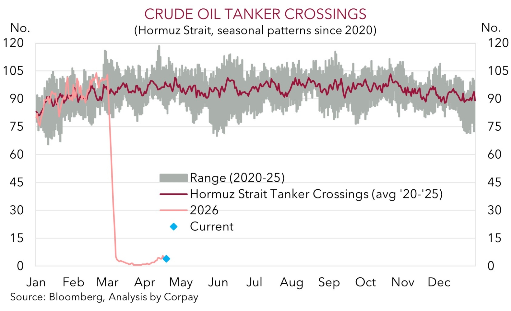 As discussed over the past few weeks, given the volatile nature of the participants involved more twists and turns regarding the Middle East conflict should be anticipated for a while yet. Moreover, the effect on supply-chains and global energy might take months/quarters to clear up, not days/weeks, even after more ‘normal’ operations resume. As our chart shows, tanker crossings in the Strait of Hormuz remain well below average. The conflict is set to cast a long shadow over the world economy with global growth set to be weaker and inflation higher than where it was predicted at the turn of the year. The latest global business PMIs (released Thursday), as well as CPI inflation figures for March from the UK (released Wednesday) and Japan (released Friday) could give a snapshot of some of the initial macro impacts. In our view, the still uneasy economic backdrop, coupled with the higher level of oil prices (because of the US’ swing to becoming a ‘net energy exporter’) may generate near-term support for the USD.