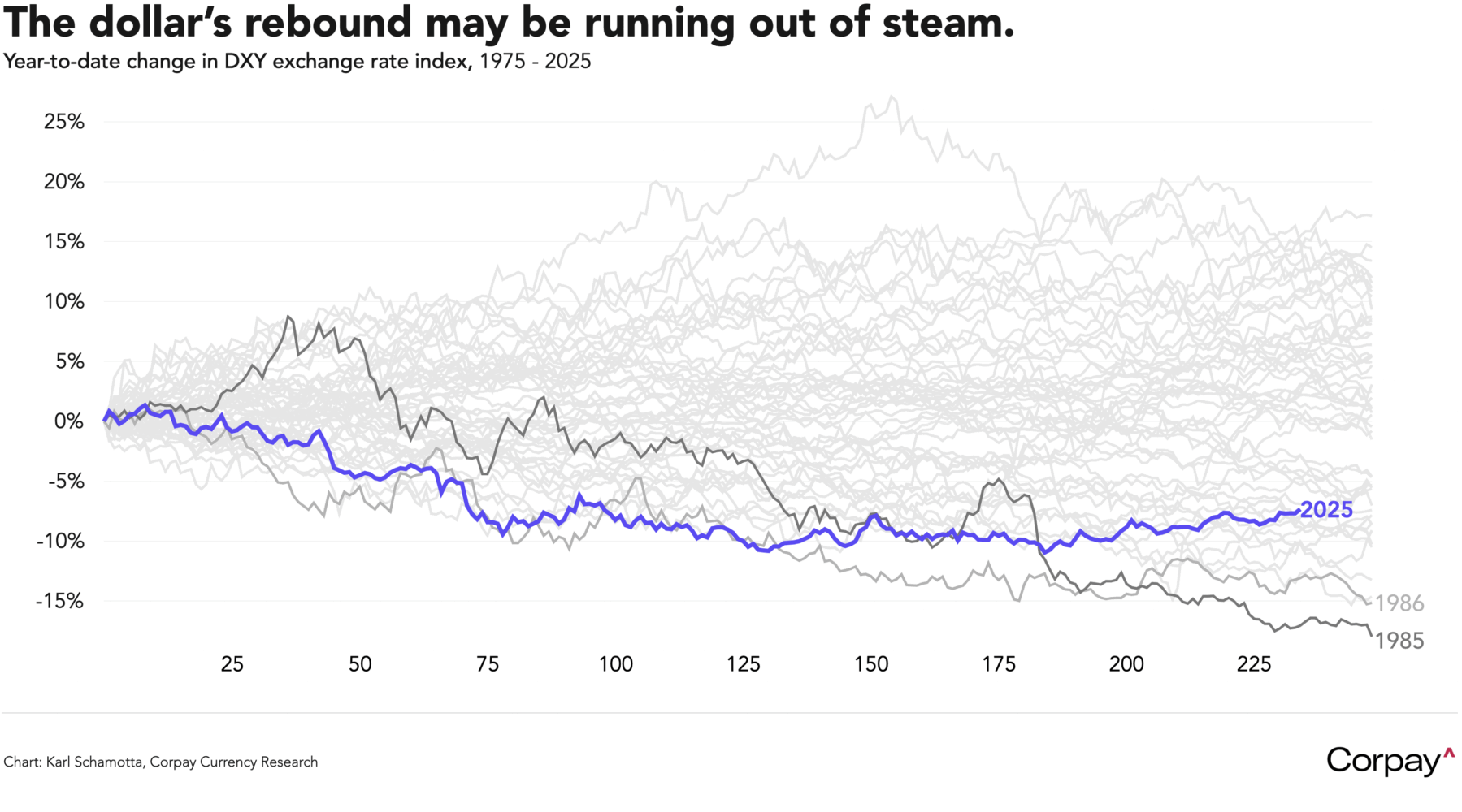 A re-widening in rate differentials is curbing the dollar’s advance, tempering a rally that has seen the currency advance 3.6 percent against a basket of its peers since the Fed’s September meeting. The closely-watched DXY index is now down -7.3 percent for the year—not disastrous, but a performance that places it near the bottom of the post-Bretton Woods range. Barring a major risk-off turn in global markets, we see limited scope for a meaningful year-end surge, and think a further downward shift in interest-rate expectations could leave the greenback vulnerable to renewed depreciation.